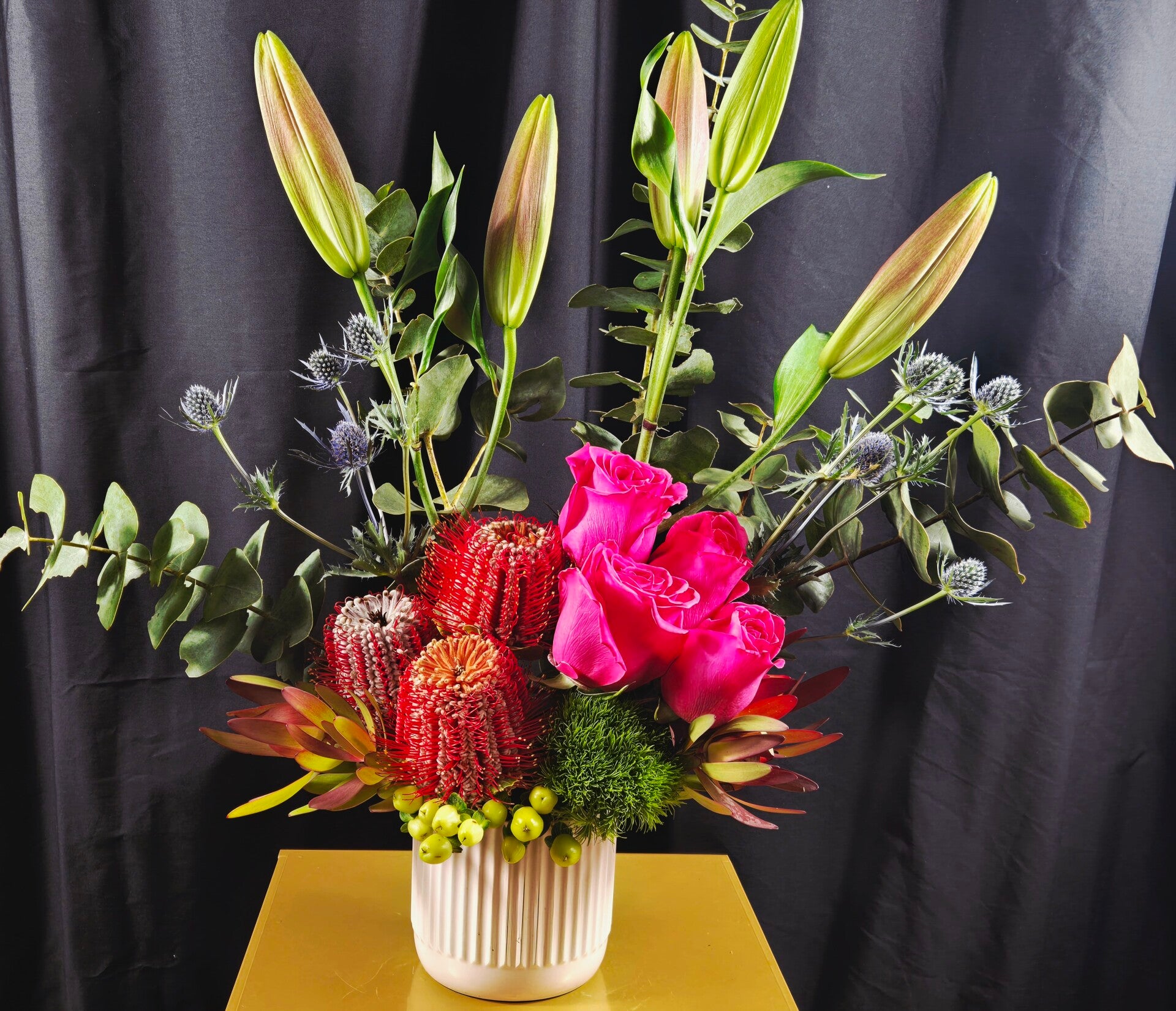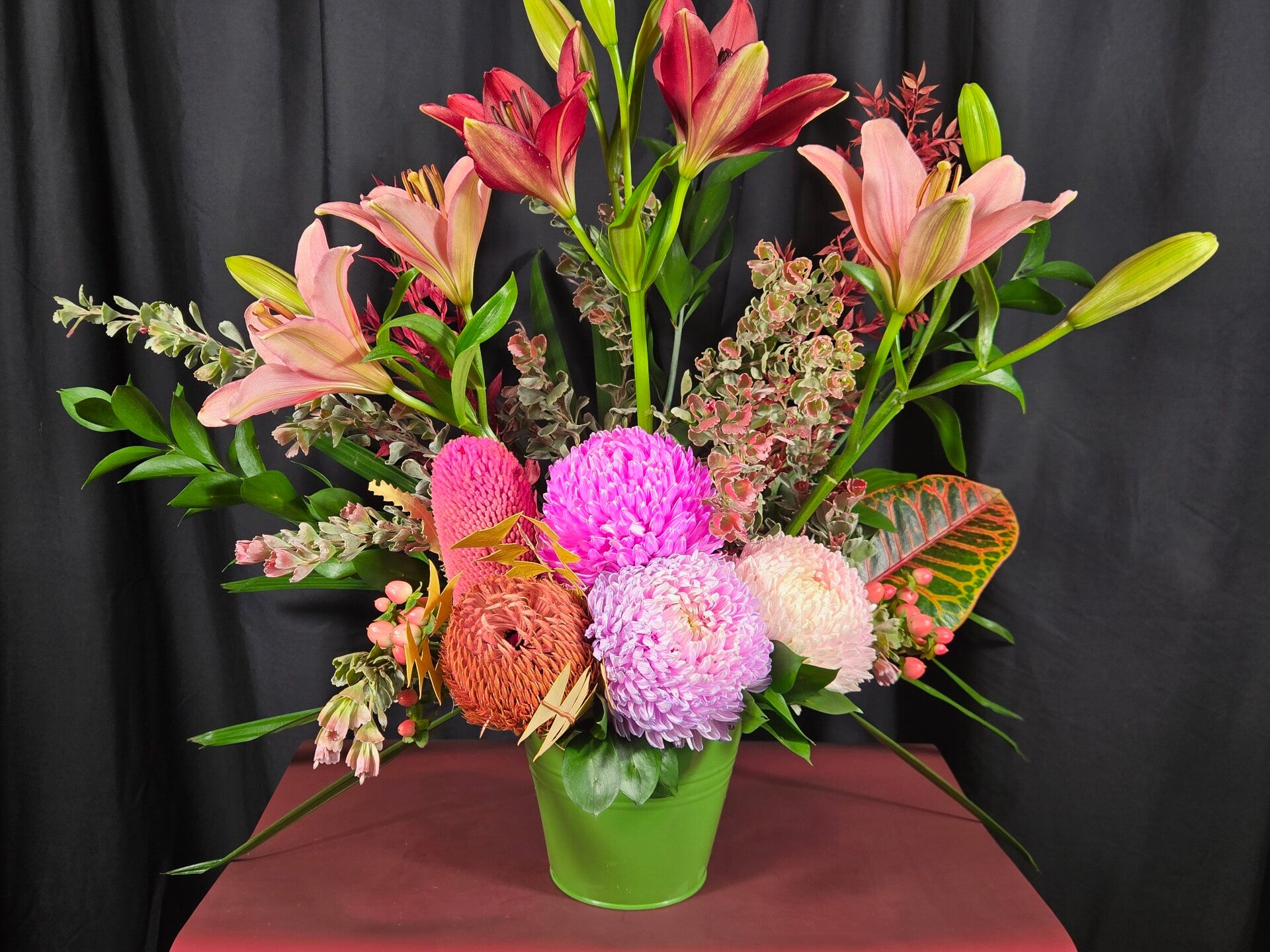 Say hello to Hello Gorgeous — a show-stopping florist’s choice arrangement designed to impress. This beautiful creation blends striking Australian natives with soft seasonal blooms, finished with lush foliage and textural accents for a truly luxurious look.