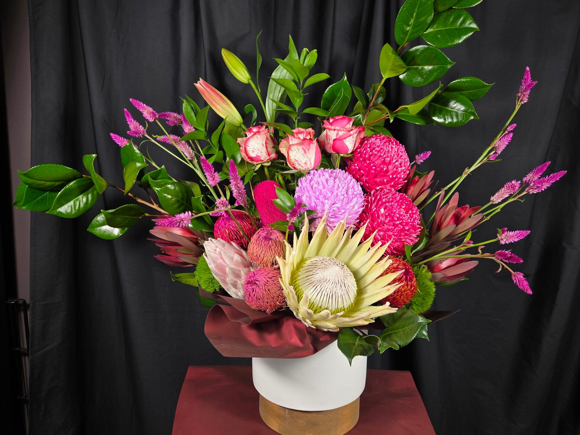 Make a statement with Hello Big Boy — a large, show-stopping florist’s choice arrangement designed for maximum impact. Bursting with texture, height and rich colour, this arrangement features a stunning mix of Australian native blooms with the option to include soft seasonal flowers for a more romantic finish.