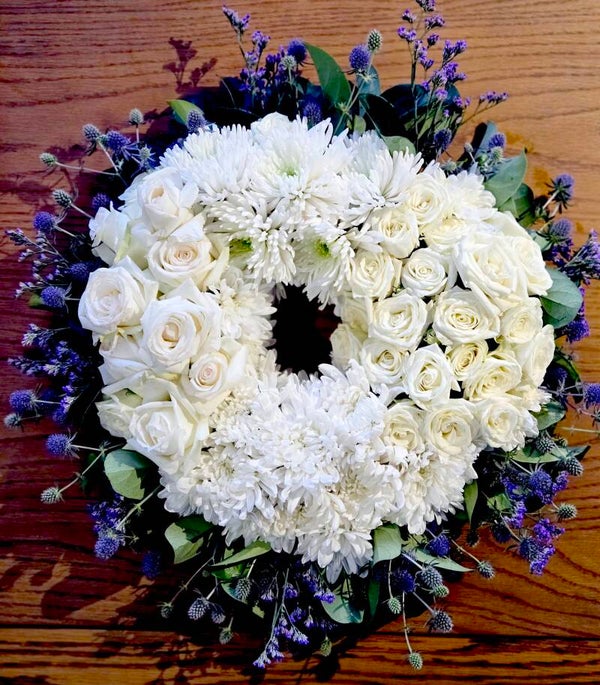 This elegant funeral wreath is a graceful way to honour and celebrate the life of a loved one. Designed in a traditional circular style to symbolise eternity and remembrance, it features a thoughtful selection of blooms.
