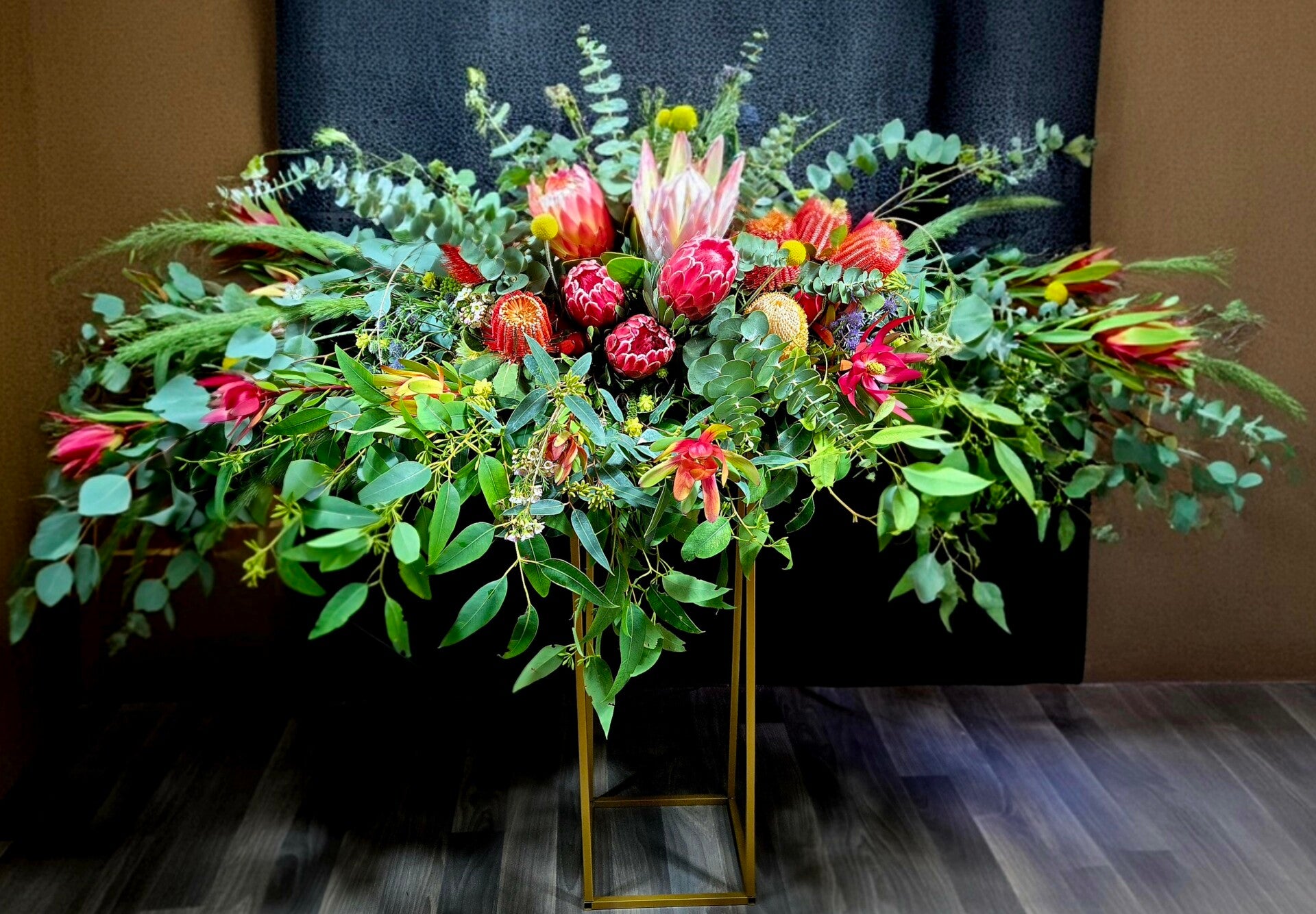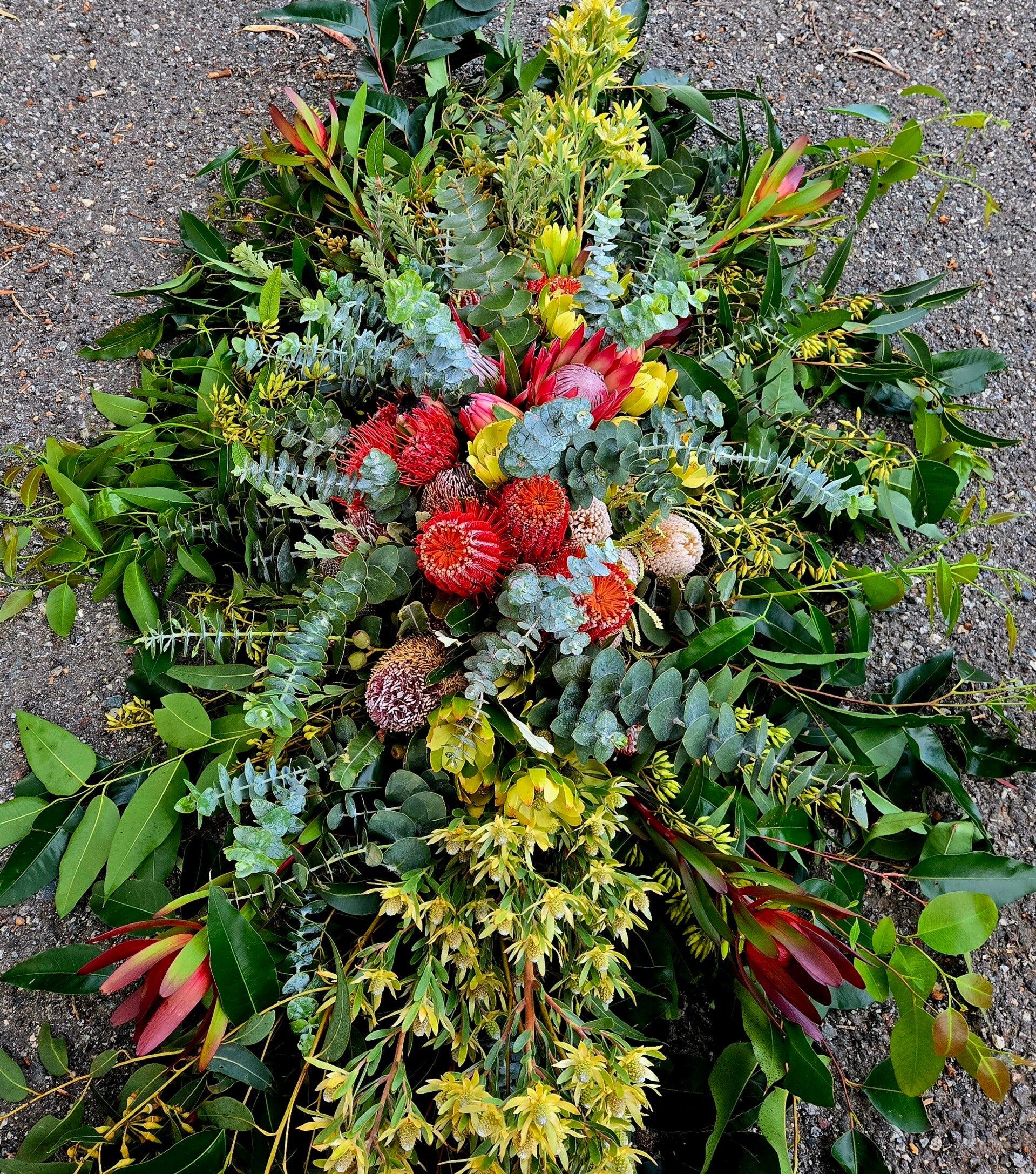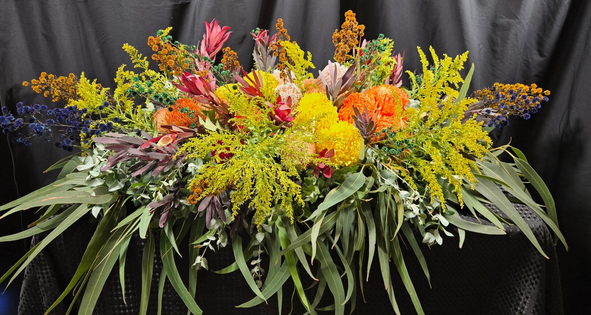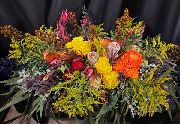 Honouring a life with the beauty of the Australian landscape, our Lavish Native Casket Spray features a stunning blend of bold banksias, majestic king proteas, golden eucalyptus blossoms, leucadendrons, and lush native foliage. Rich in texture, colour, and natural form, this full-length tribute celebrates strength, resilience, and the enduring spirit of nature.