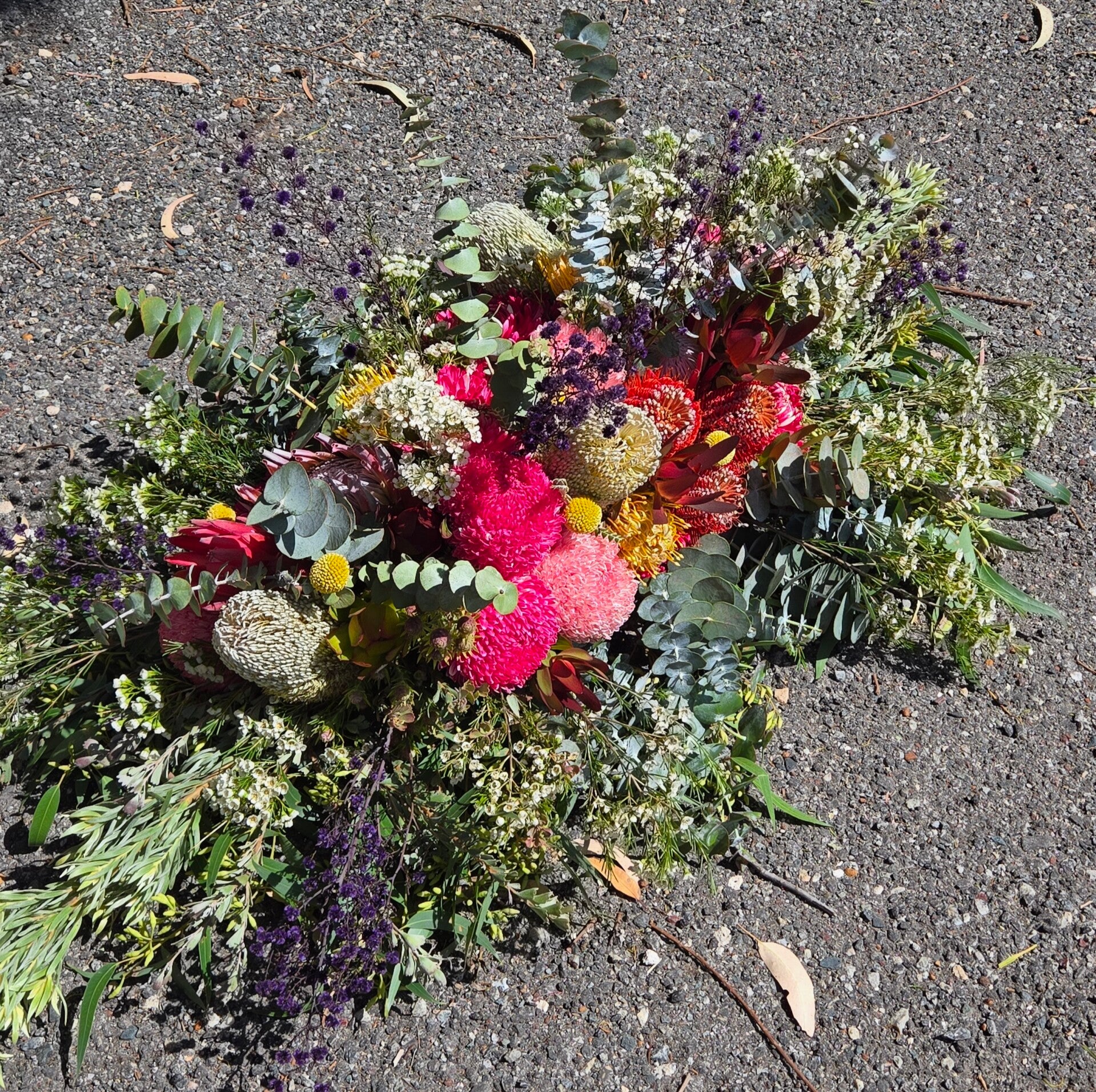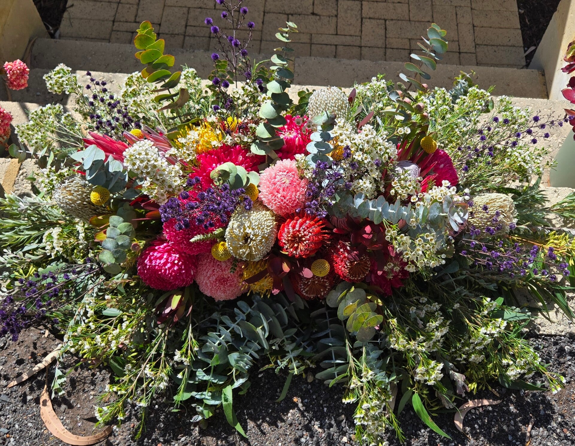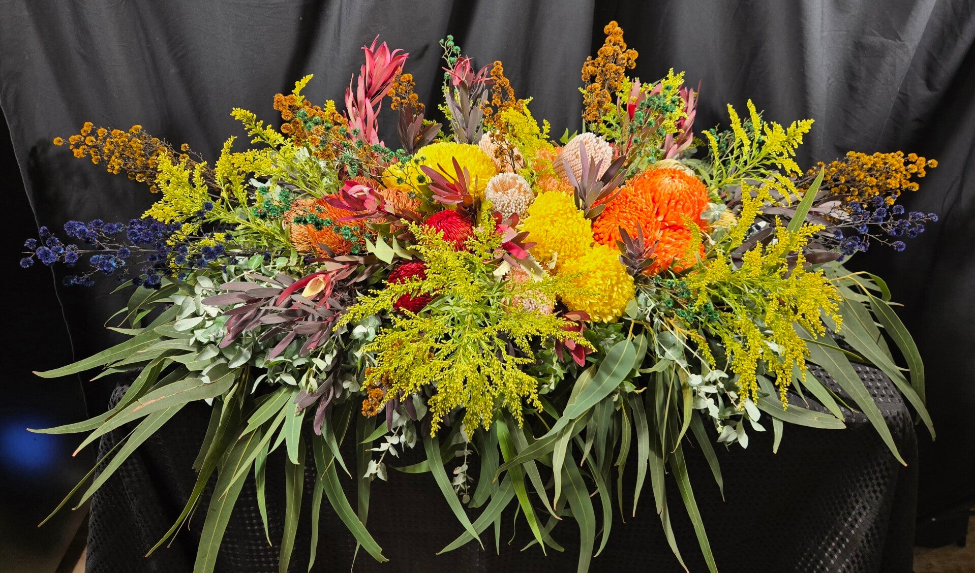 Honouring a life with the beauty of the Australian landscape, our Lavish Native Casket Spray features a stunning blend of bold banksias, majestic king proteas, golden eucalyptus blossoms, leucadendrons, and lush native foliage. Rich in texture, colour, and natural form, this full-length tribute celebrates strength, resilience, and the enduring spirit of nature.