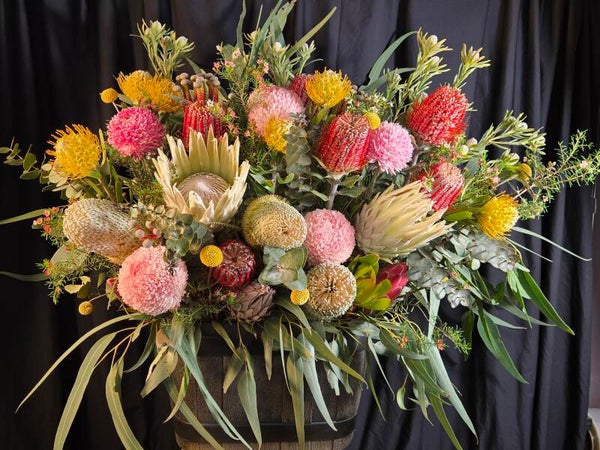 A breathtaking display of Australia’s finest native blooms, this arrangement is overflowing with rich textures, bold shapes, and earthy tones. Featuring striking proteas, banksias, leucadendrons, billy buttons, wax flowers, and lush seasonal foliage, it is designed to capture the raw beauty of the Australian landscape. Approximately 60cm W X 70cm H