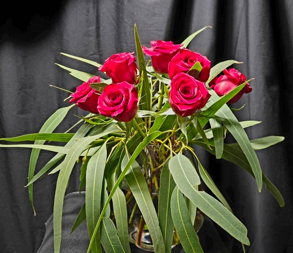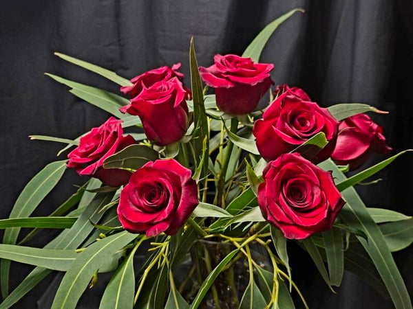 A timeless symbol of love and elegance, this arrangement features 8 rich, velvety red roses surrounded by lush gum leaves, beautifully displayed in a clear mushroom glass vase. Perfect for anniversaries, romantic gestures, or special occasions, these roses are arranged to create a striking balance of bold colour and natural charm.