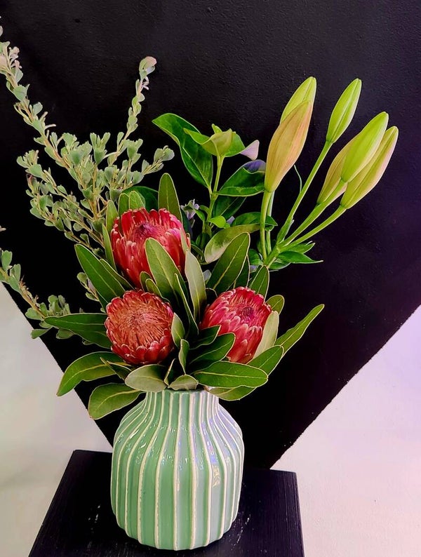 A striking vase arrangement featuring bold pink proteas paired with elegant lily buds and lush greenery. The textured ceramic vase adds a modern touch, making this piece a beautiful gift or statement décor for any space.