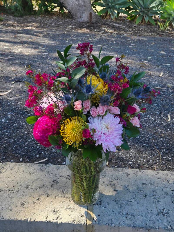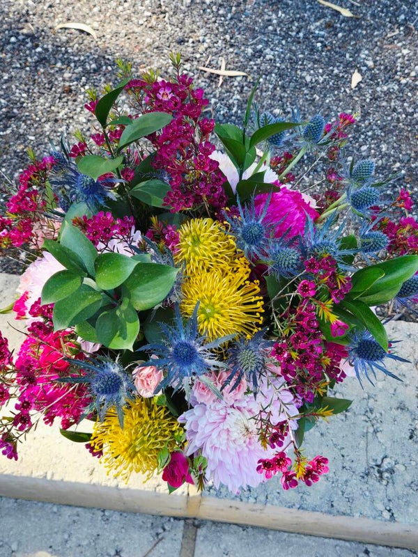 Bursting with colour and texture, this stunning vase arrangement combines the best of both worlds — striking Australian natives and delicate soft blooms. Featuring vivid pink chrysanthemums, electric blue sea holly, magenta waxflower, yellow pin cushions and lush foliage, this design radiates joy and natural beauty.