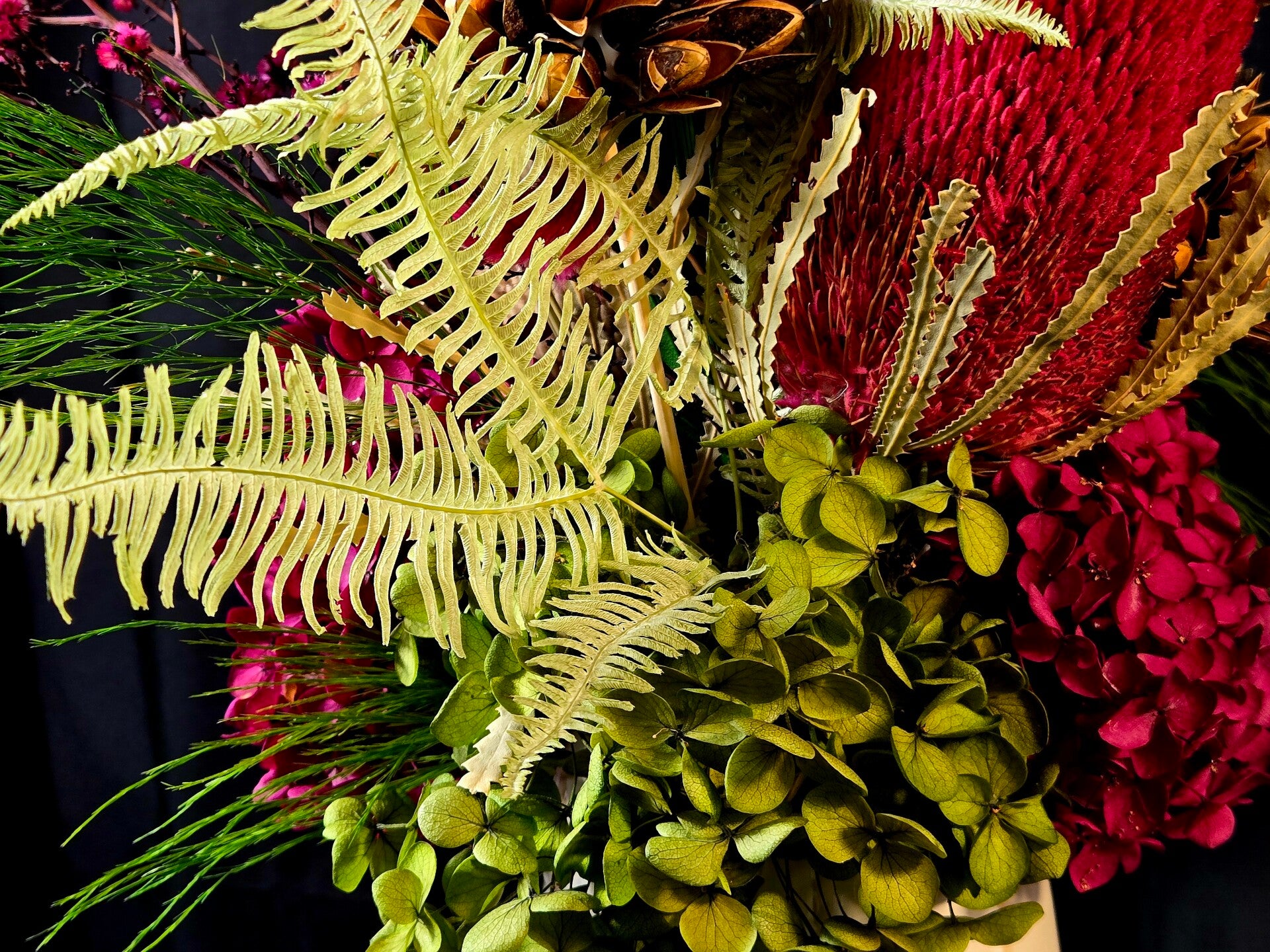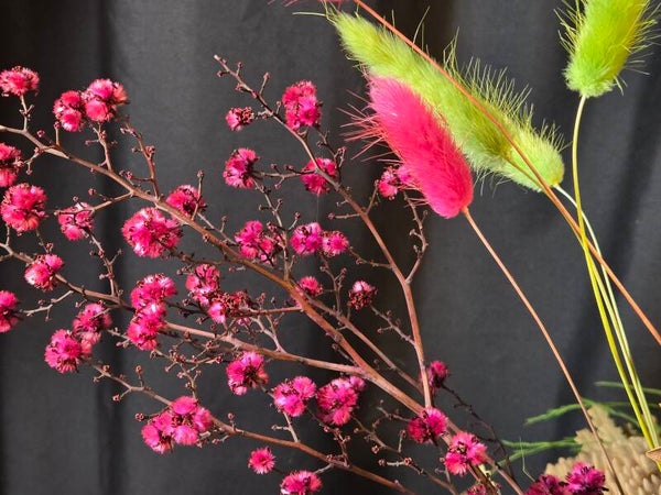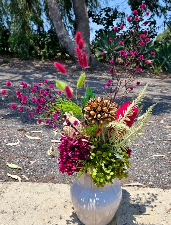 Hand-crafted by a professional florist, this stunning design blends preserved Australian natives with soft, textural blooms including magenta banksia, magnolia flowers , ferns, hydrangea, and bunny tails. A long-lasting, maintenance-free arrangement that brings the beauty of nature indoors. Each piece is one-of-a-kind and uniquely crafted in our signature Wild Bunch Florist style.