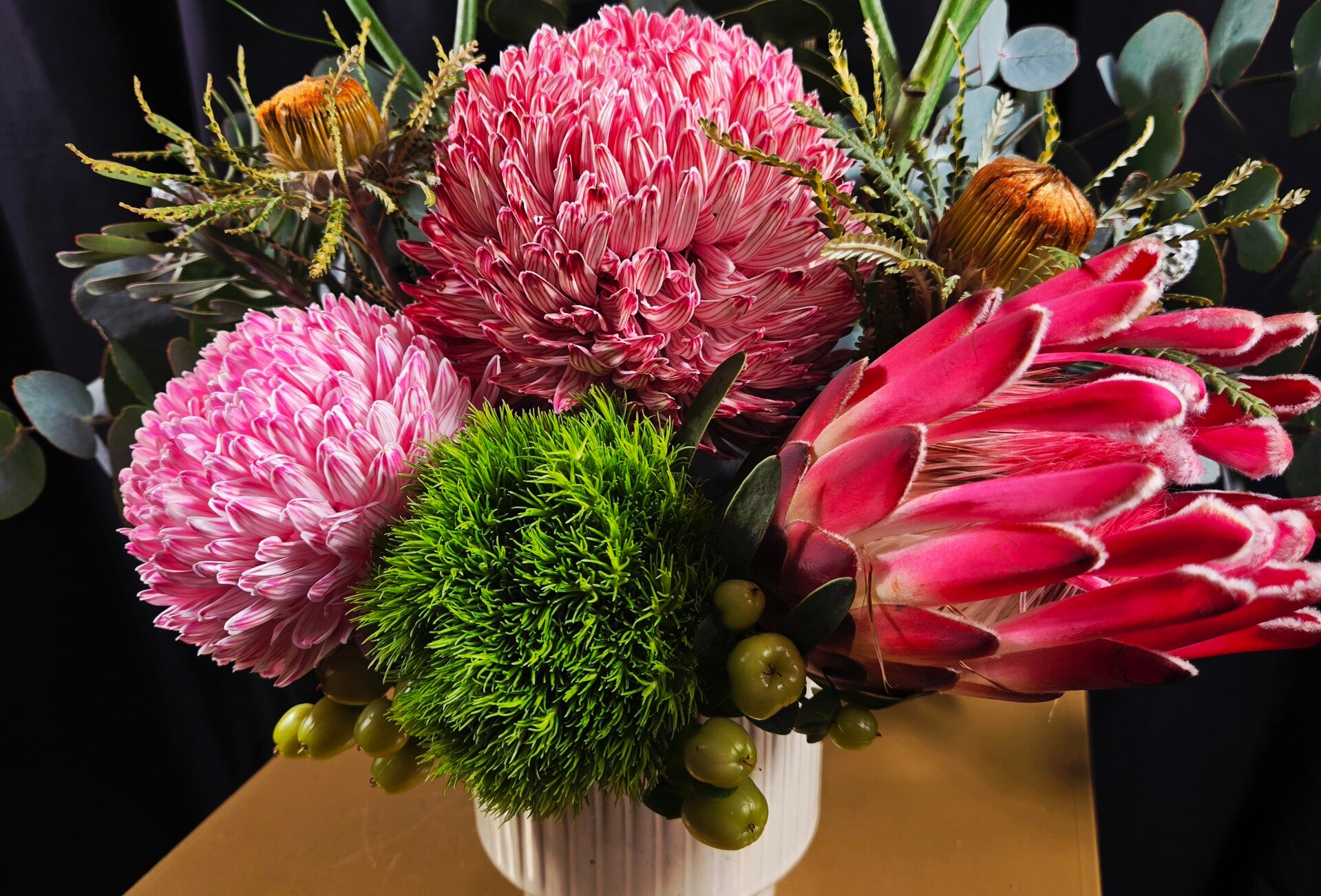 This vibrant native-inspired arrangement features lush Mum chrysanthemums, striking Venus protea, Formosa banksia,