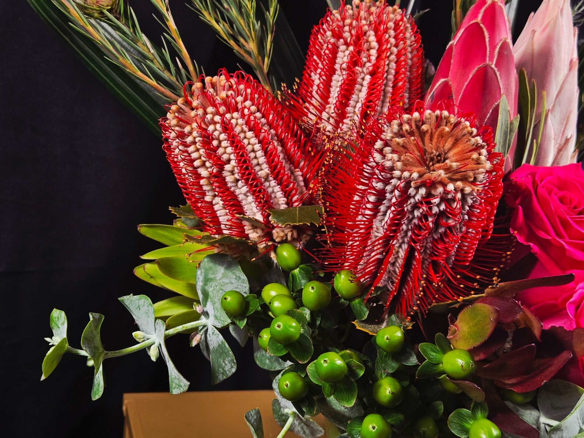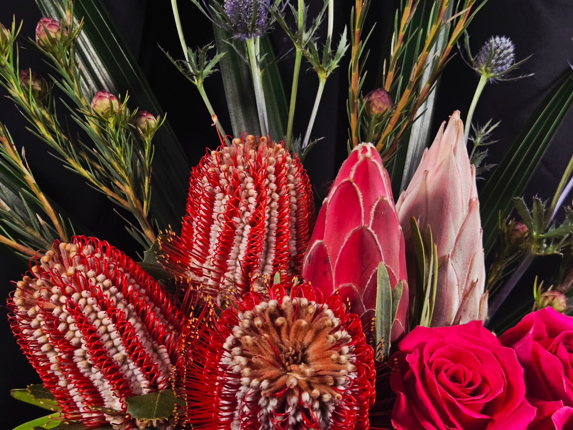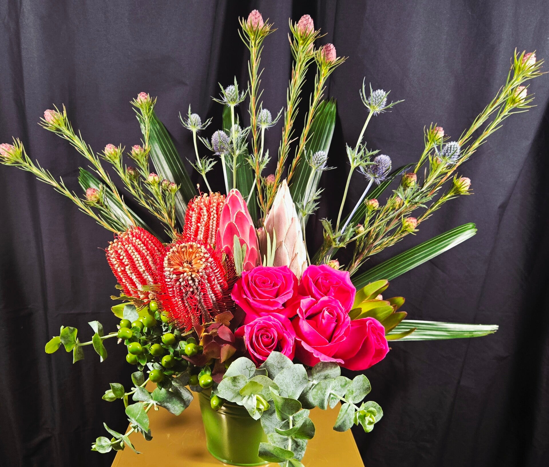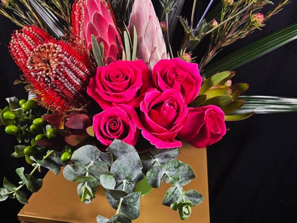 Expertly arranged by our florist, this piece features rich red banksias, velvety king protea, vibrant fuchsia roses, delicate blue sea holly, lush greens, tropical foliage and fresh eucalyptus. Every stem is selected for quality and freshness, ensuring a long-lasting arrangement that showcases both texture and colour in a modern, elegant style.