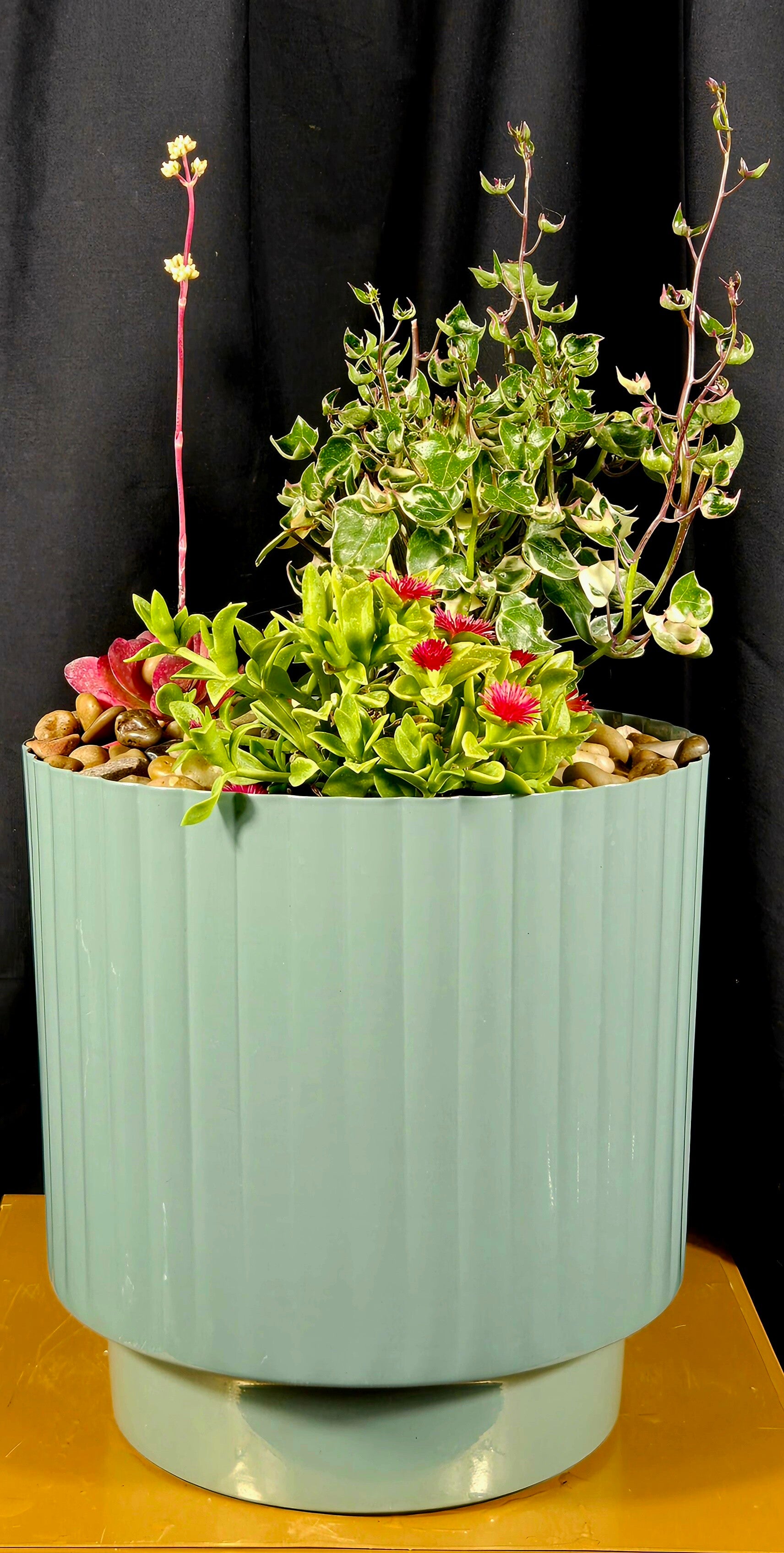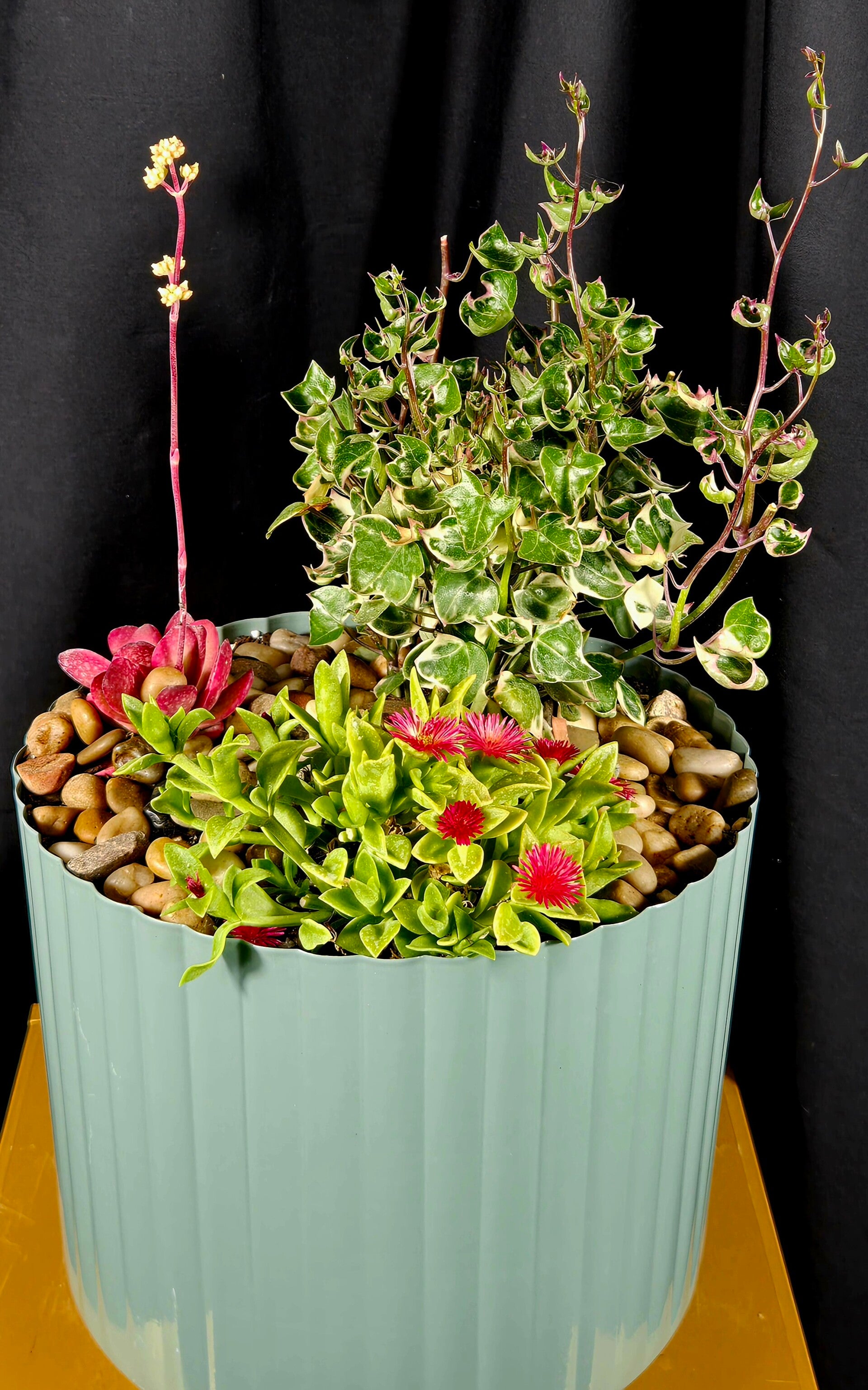 This stunning mixed succulent pot is a true living gift, thoughtfully planted with a variety of premium succulents and flowering varieties, beautifully styled in a modern pot and finished with natural pebbles for a polished, contemporary look.
