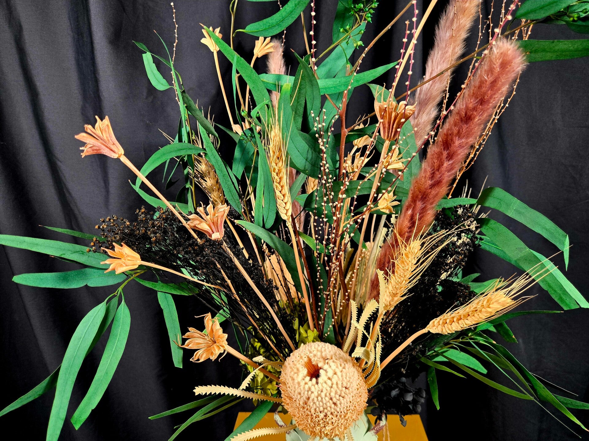 Bushland Beauty is a bold Australiana-inspired preserved arrangement, designed to be admired from every angle. Created as a double-sided table centre, this statement piece is perfect for kitchen islands, farmhouse tables, sideboards or open shelving where it can be enjoyed front and back.
