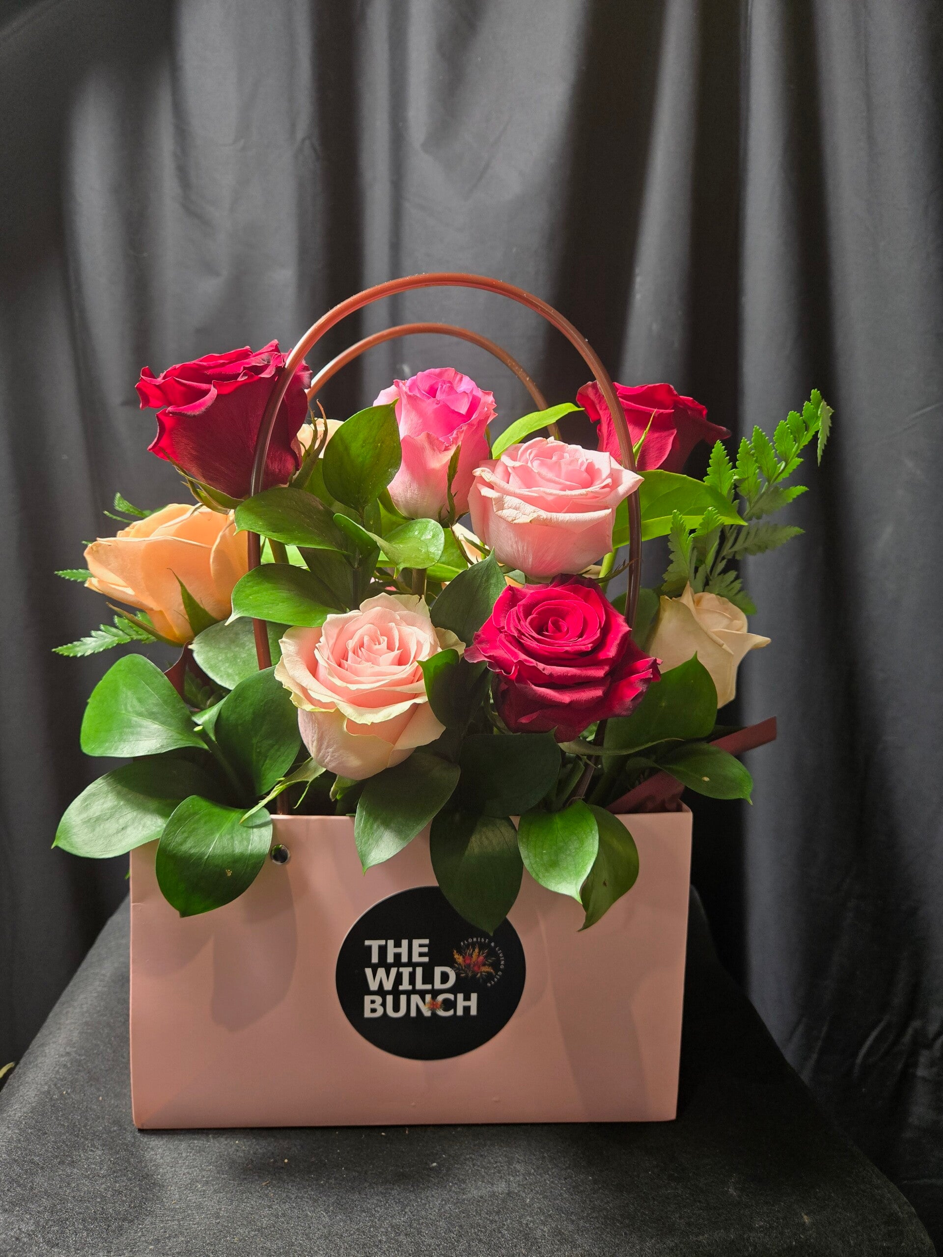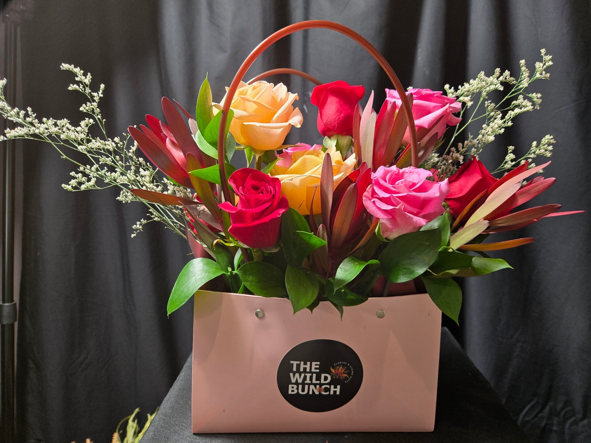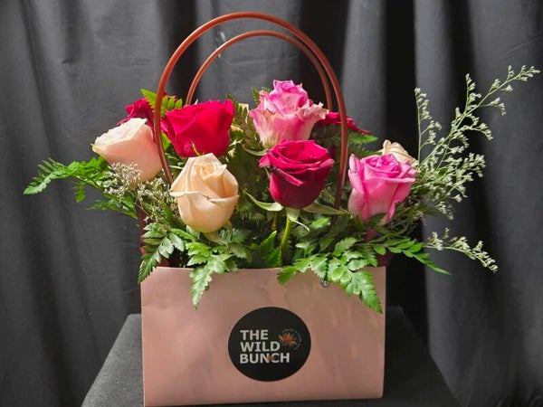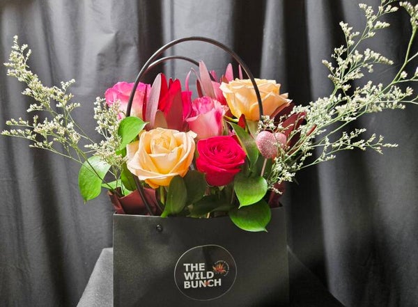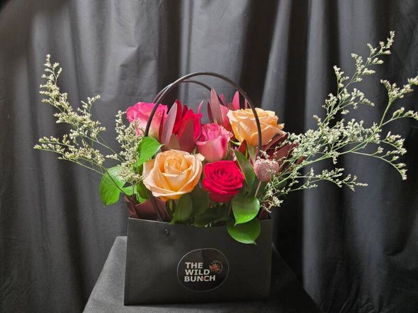 Say I love you in the most unforgettable way with our Rose Bag, beautifully arranged in our signature Wild Bunch carry bag and filled with a luxurious mix of 10 premium roses, lush foliage, and romantic finishing touches.