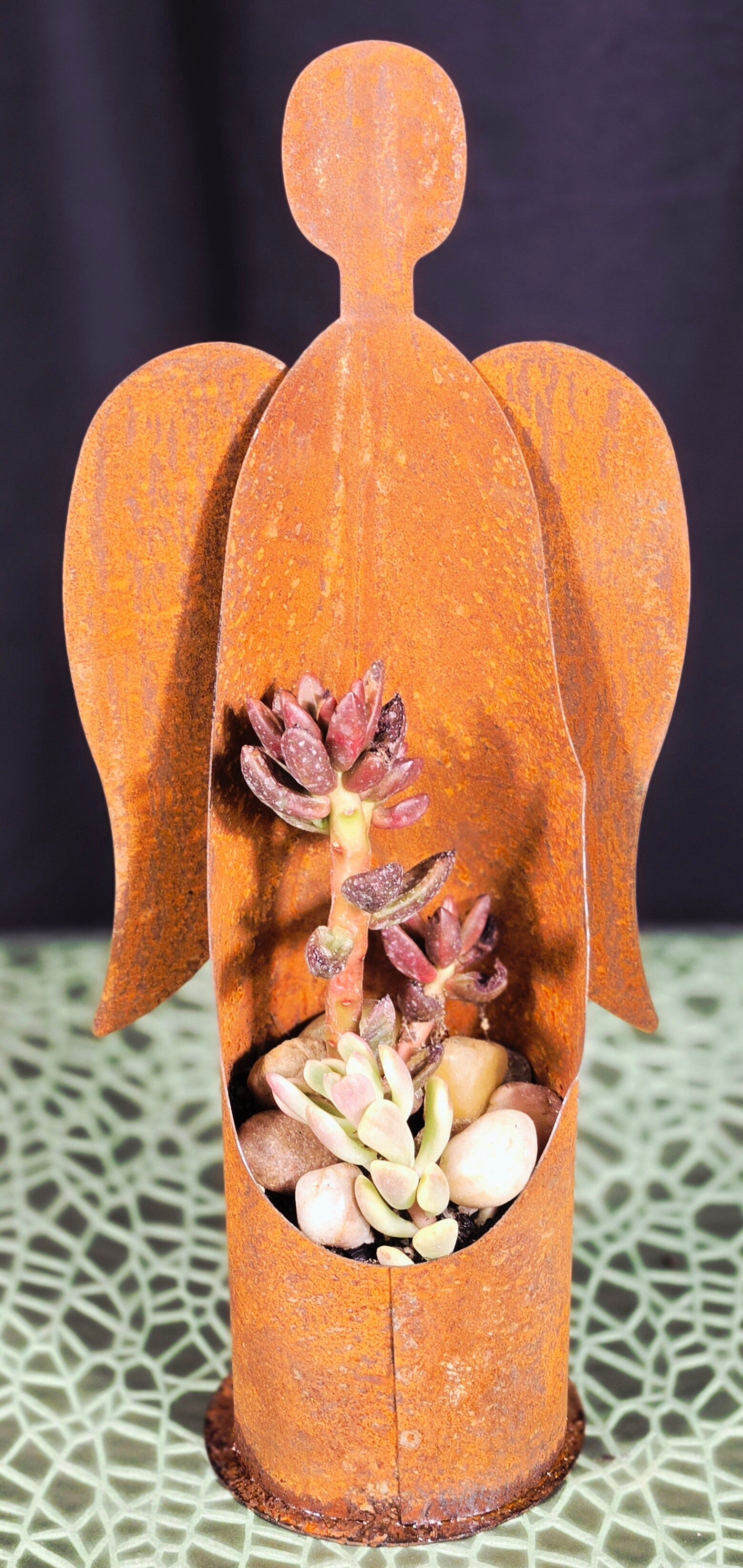 Crafted from weathered metal with a beautifully aged patina, this rustic angel is a striking and versatile statement piece. Designed with soft sculptural wings and a central vessel, it can be styled as a planter for succulents or small plants, or used as a candle holder to create a warm, peaceful glow.