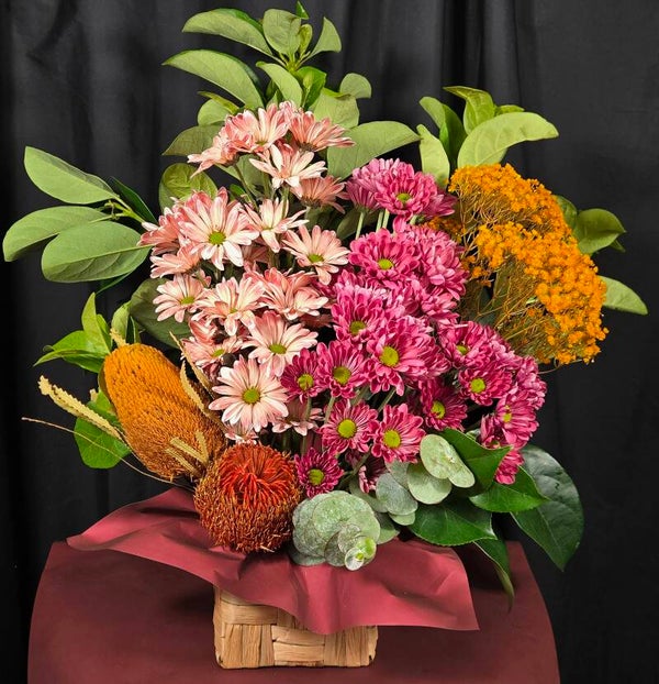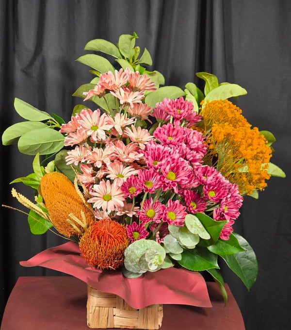 This striking arrangement is a celebration of texture, colour, and Australiana charm. Designed in a modern banana leaf basket, it features a lush mix of Australian natives and complementary seasonal blooms, thoughtfully layered to create depth, movement, and long-lasting beauty.