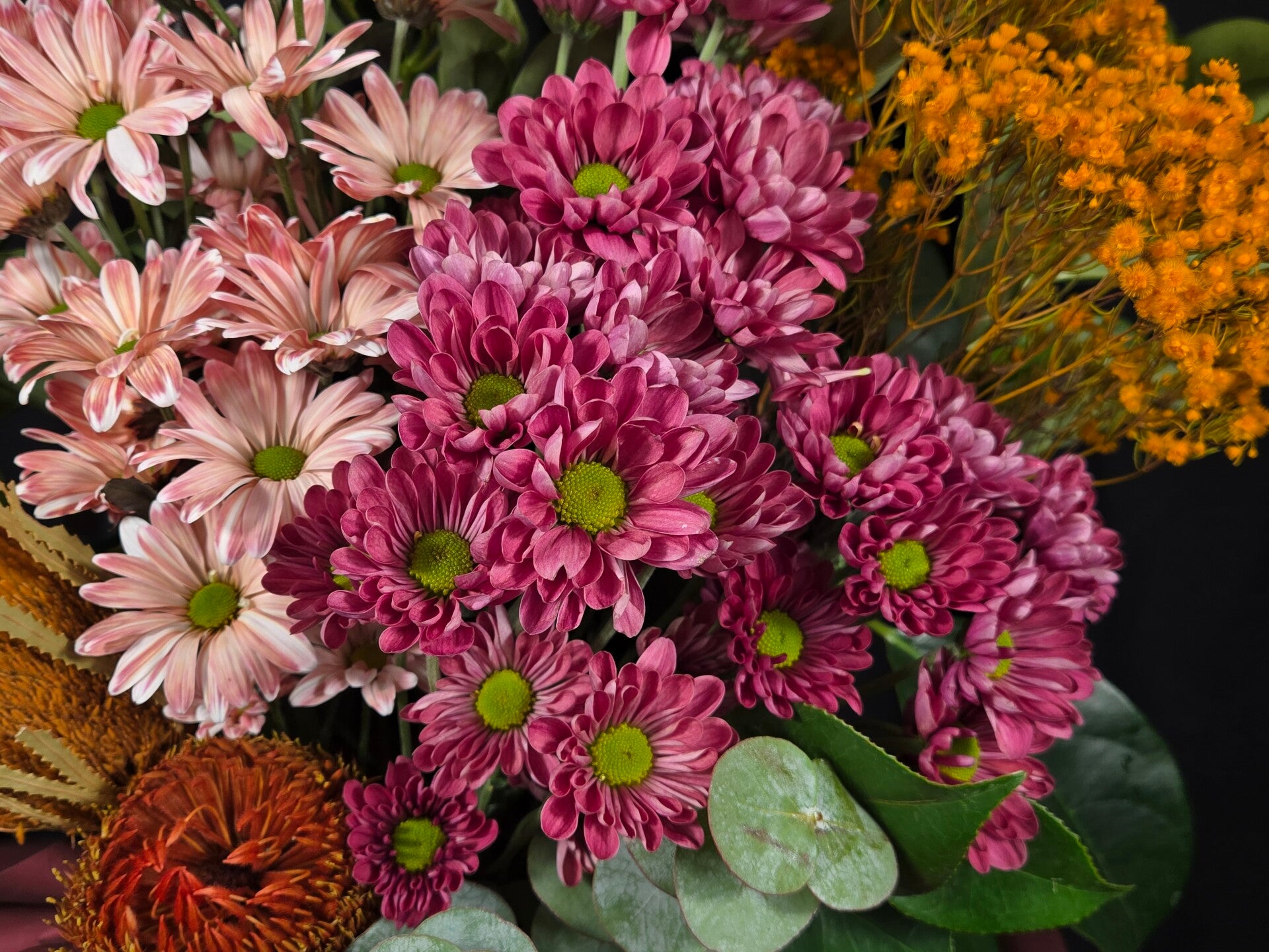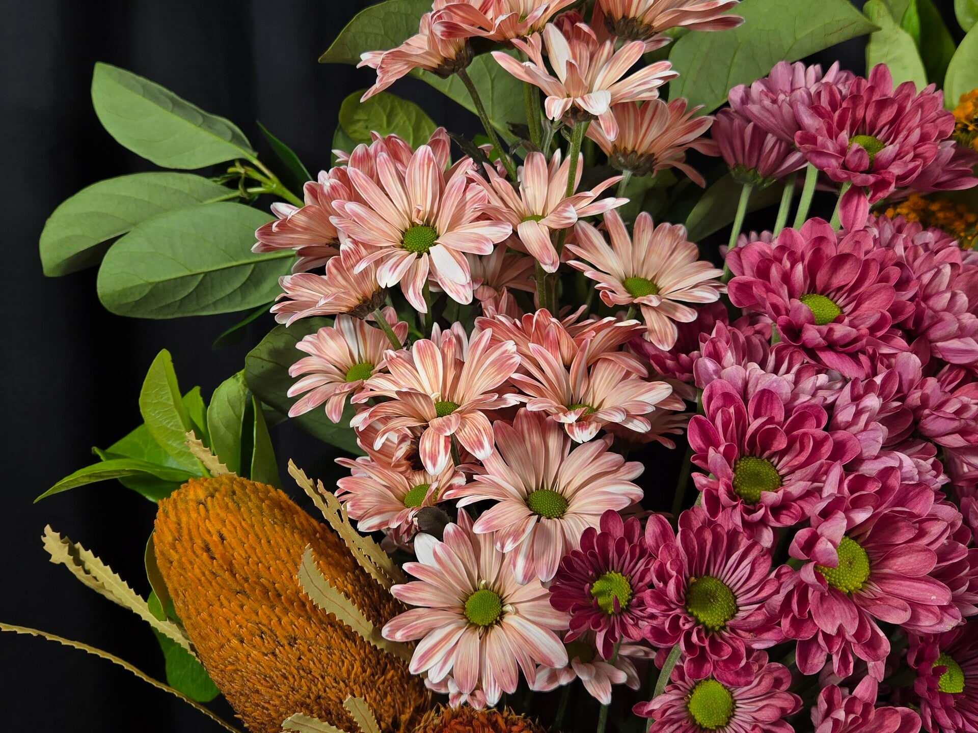 Showcasing sculptural elements such as banksia, textured natives, and vibrant chrysanthemum blooms, each arrangement is individually handcrafted, making no two exactly the same. Earthy tones are balanced with rich pops of colour and finished with natural foliage for a bold yet elegant look.