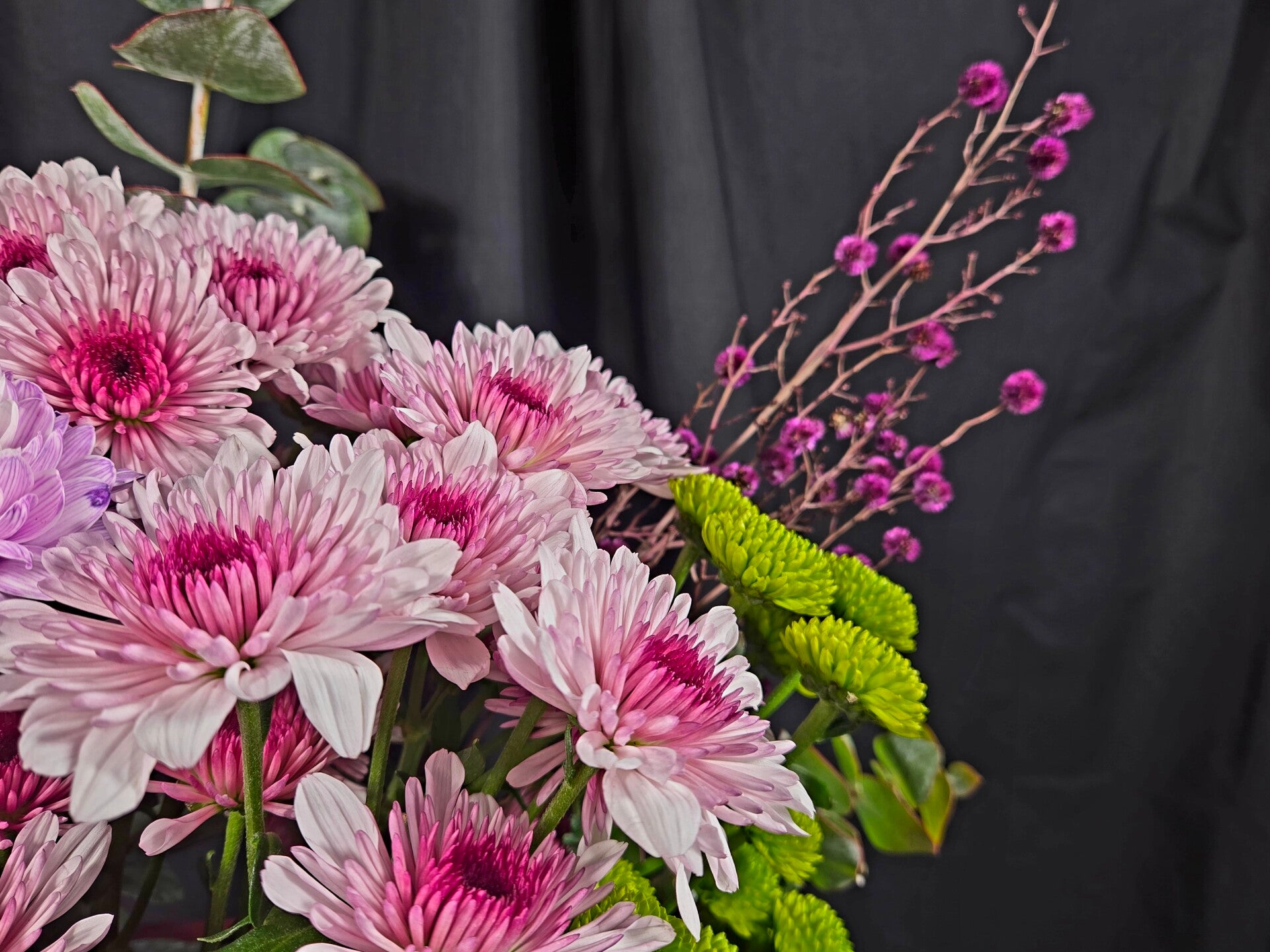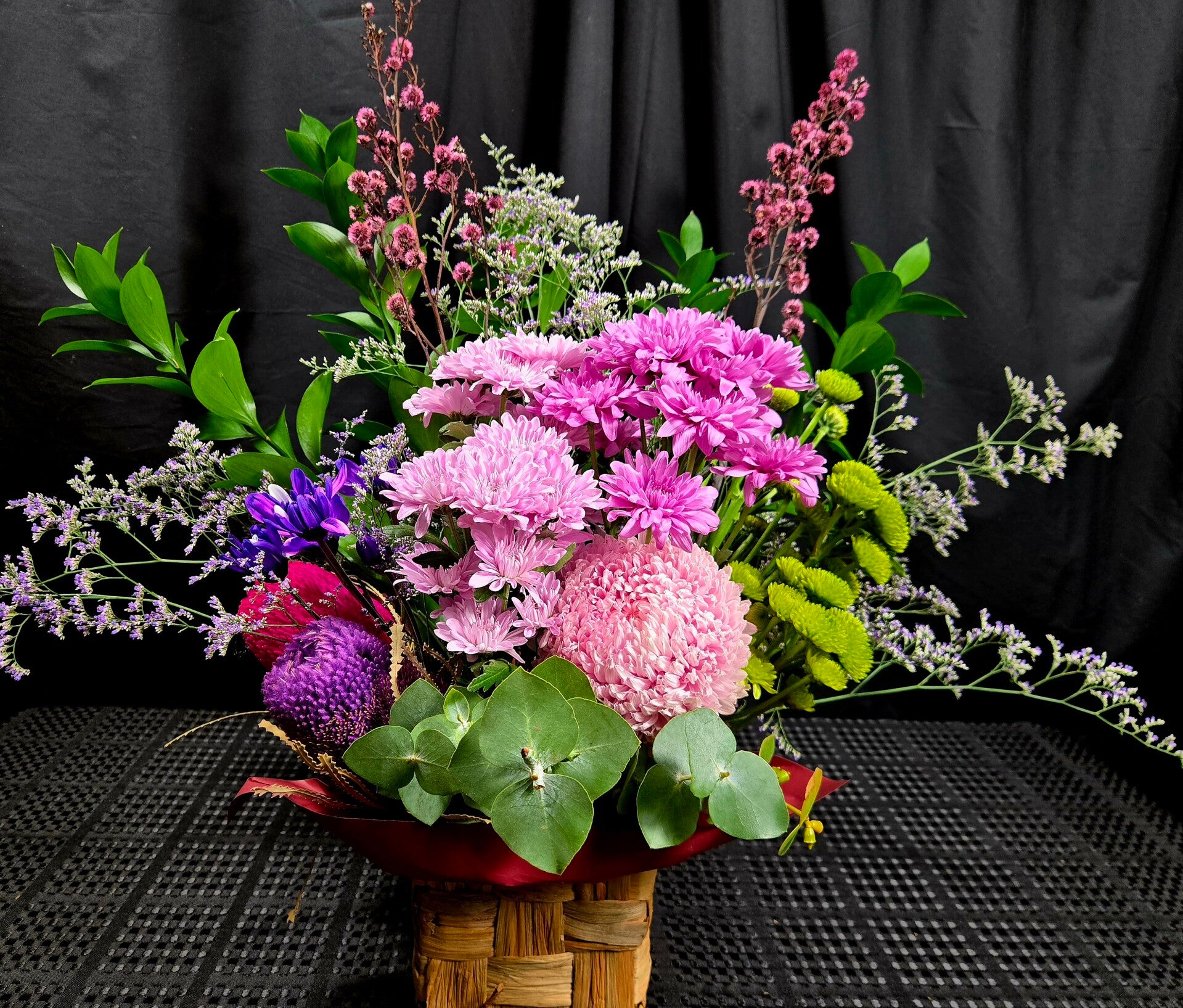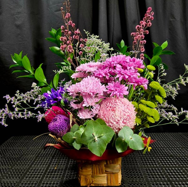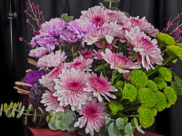 Featuring layers of pink and lilac chrysanthemums, vibrant green button mums, sculptural banksia and flowing eucalyptus, this arrangement is all about volume, texture and feel-good colour.