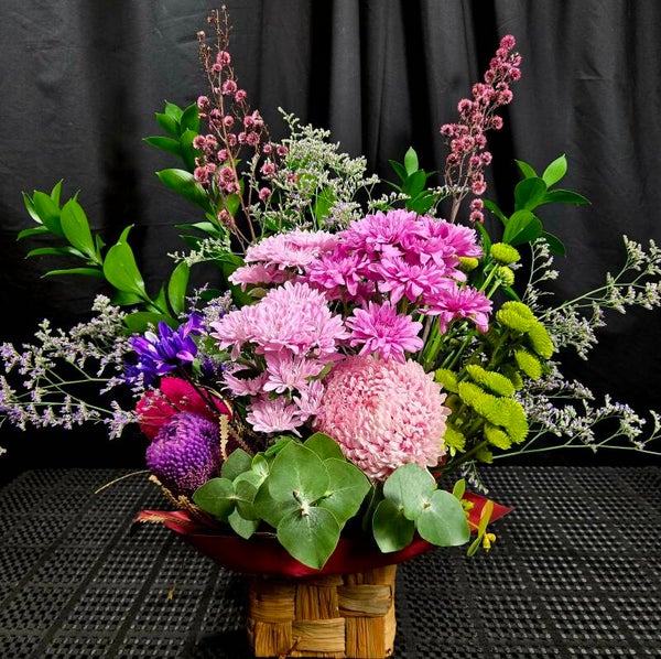 Soft, fluffy and full of personality, the Pretty Little Drama Basket is a gorgeous mix of seasonal blooms and textured natives designed to steal the spotlight.