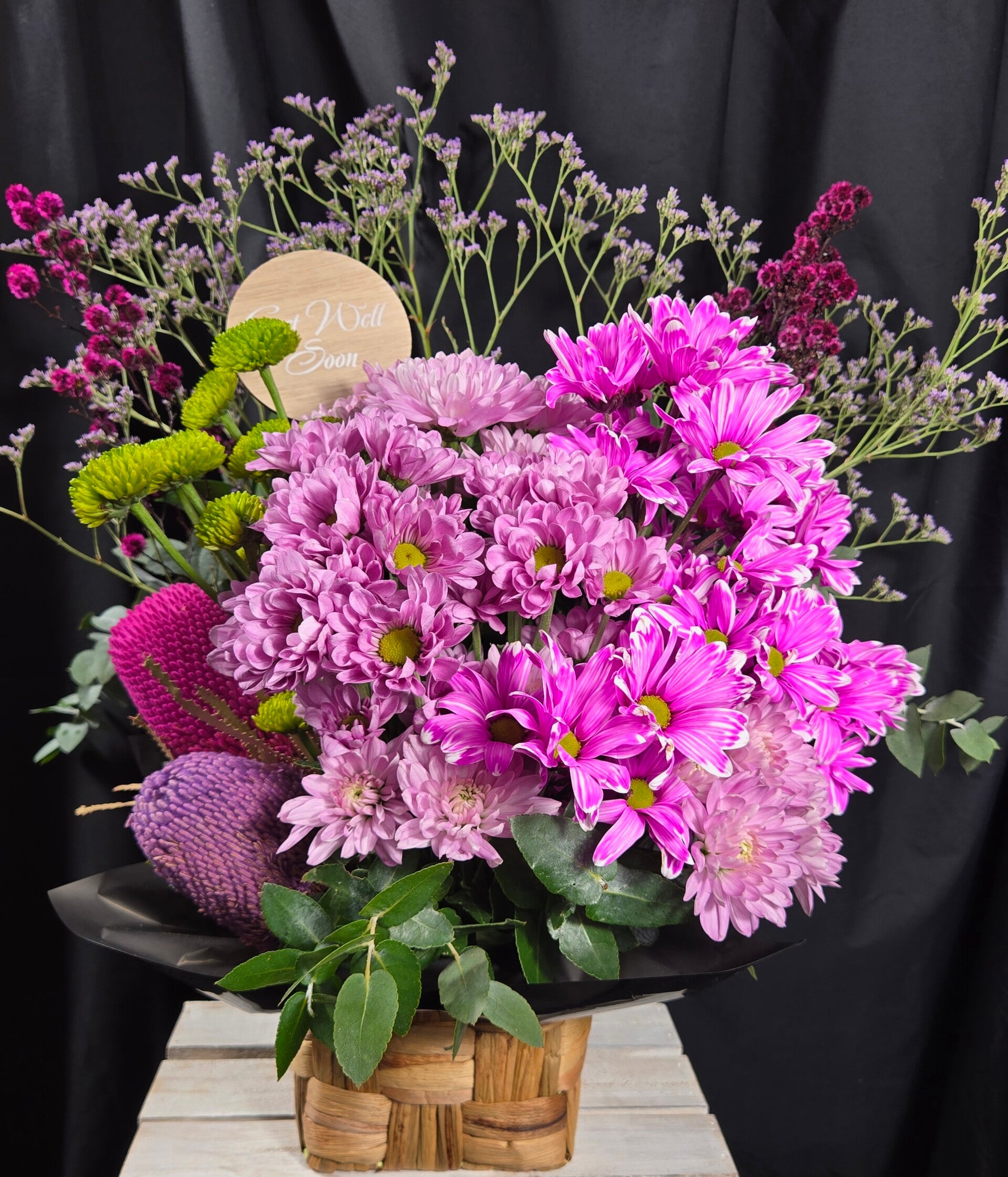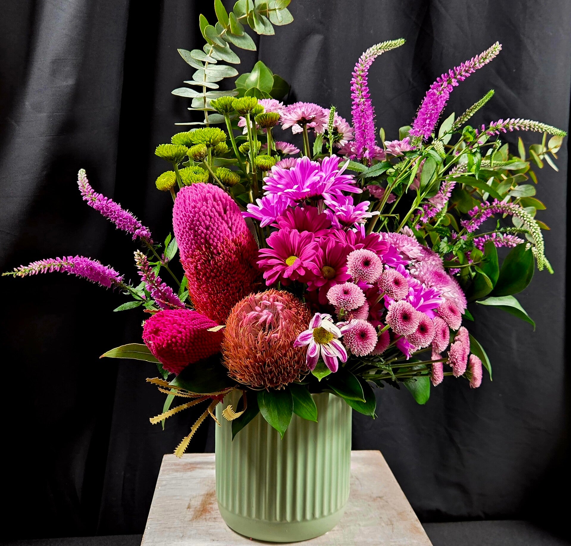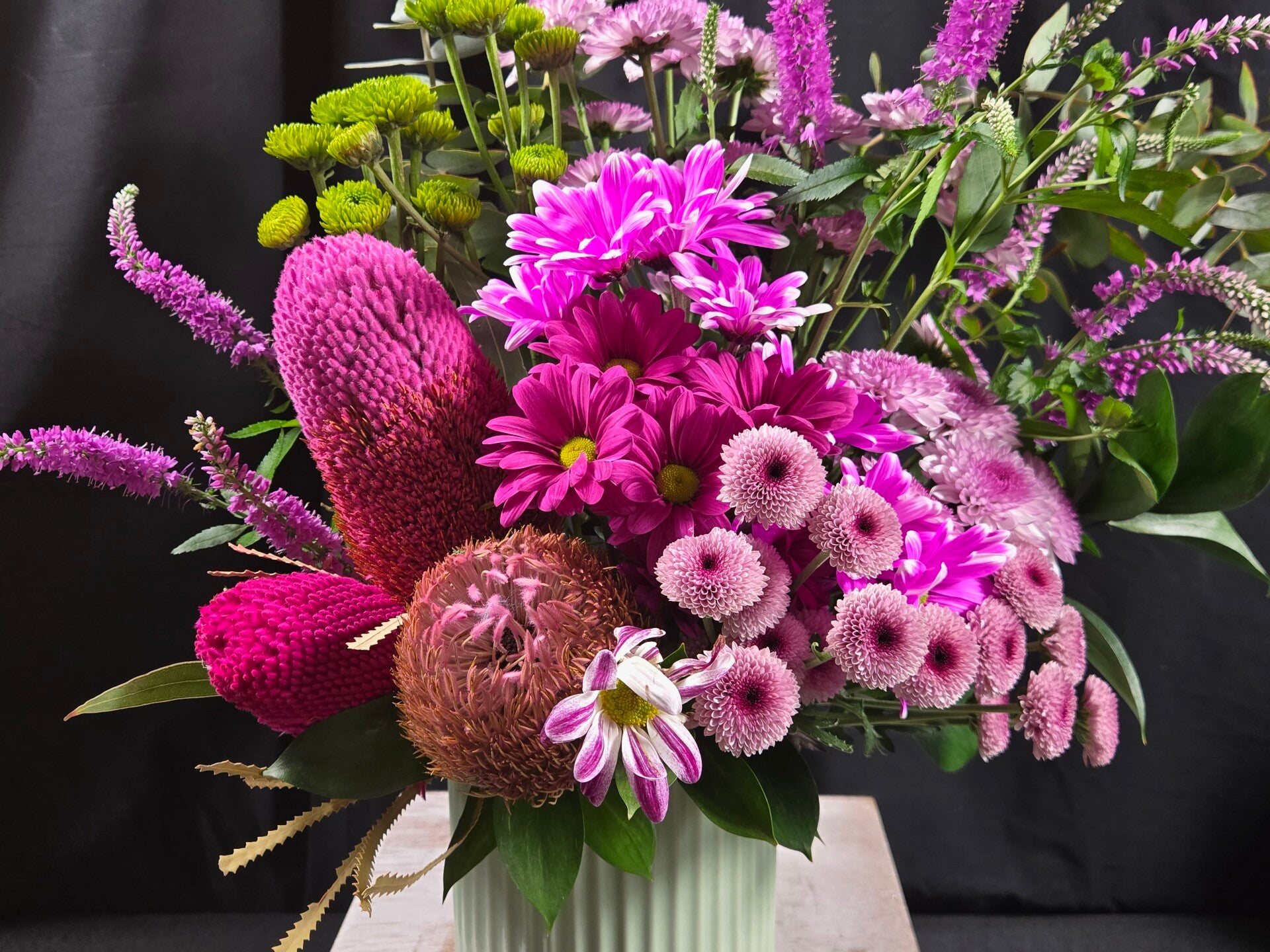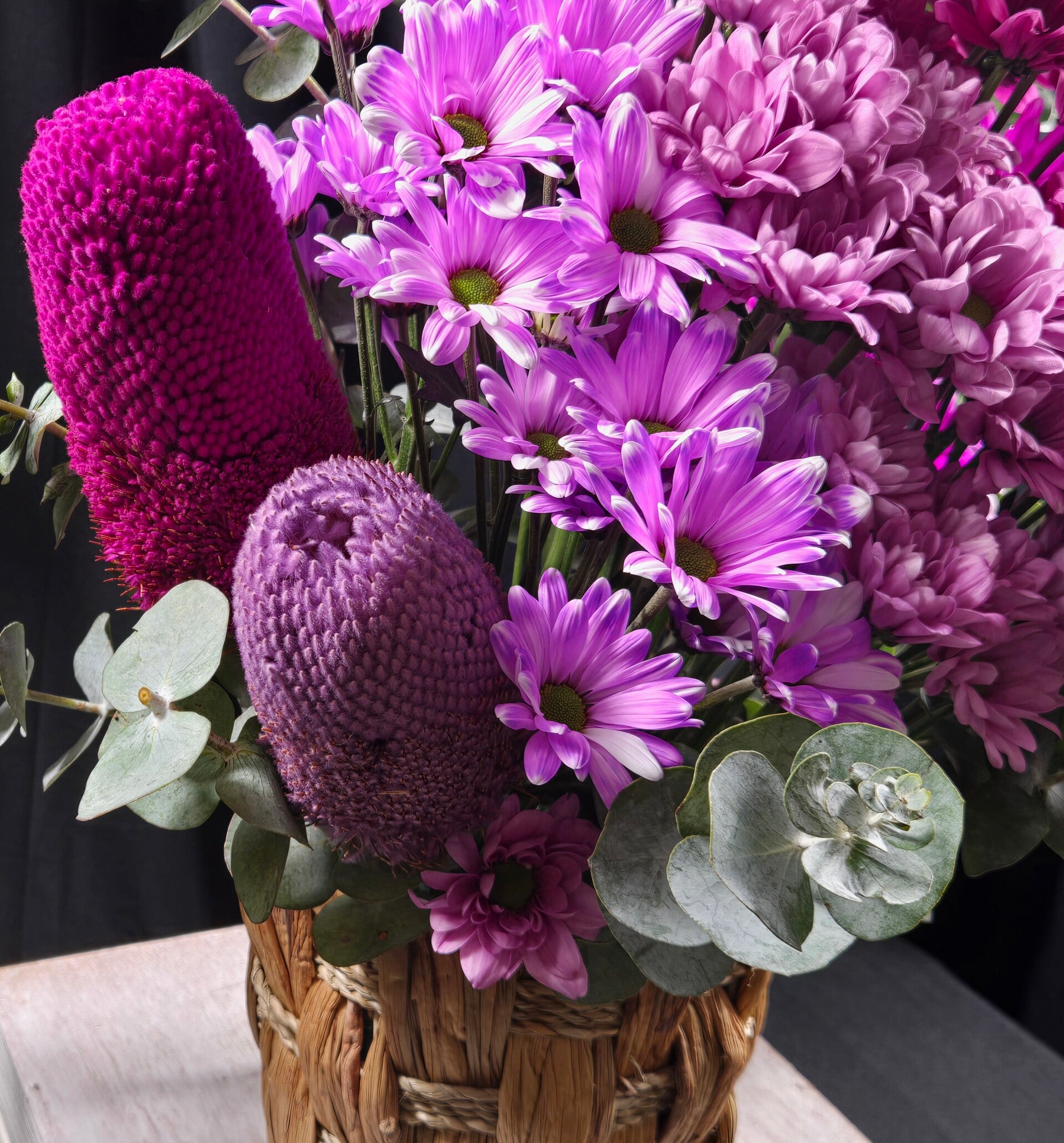 Featuring layers of pink and lilac chrysanthemums, sculptural banksia and flowing eucalyptus, this arrangement is all about volume, texture and feel-good colour.