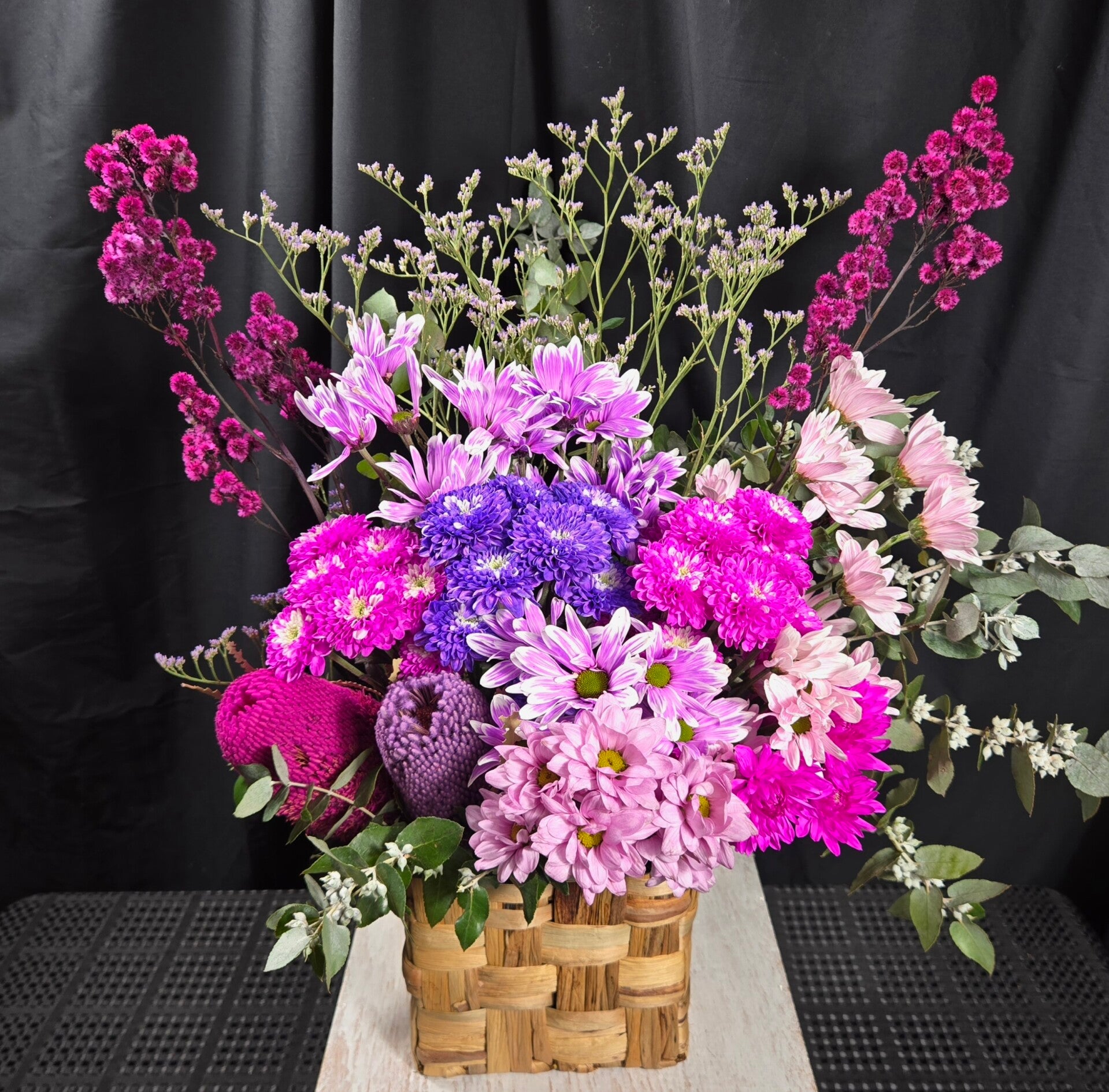 Soft, fluffy and full of personality, the Pretty Little Drama Basket is a gorgeous mix of seasonal blooms and textured natives designed to steal the spotlight.