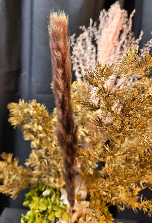 Soft, elegant and effortlessly stylish, Golden Blush Everlasting is a beautifully balanced preserved arrangement designed to bring warm, neutral tones into any space. Featuring airy golden preserved foliage, delicate blush textures, and natural hydrangea clusters, this piece offers height, movement and a refined modern feel in a compact size.