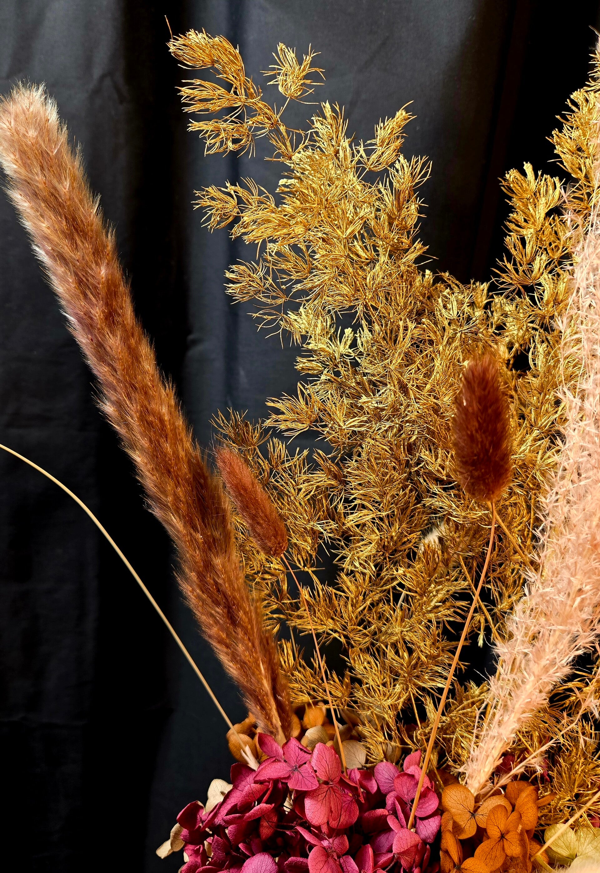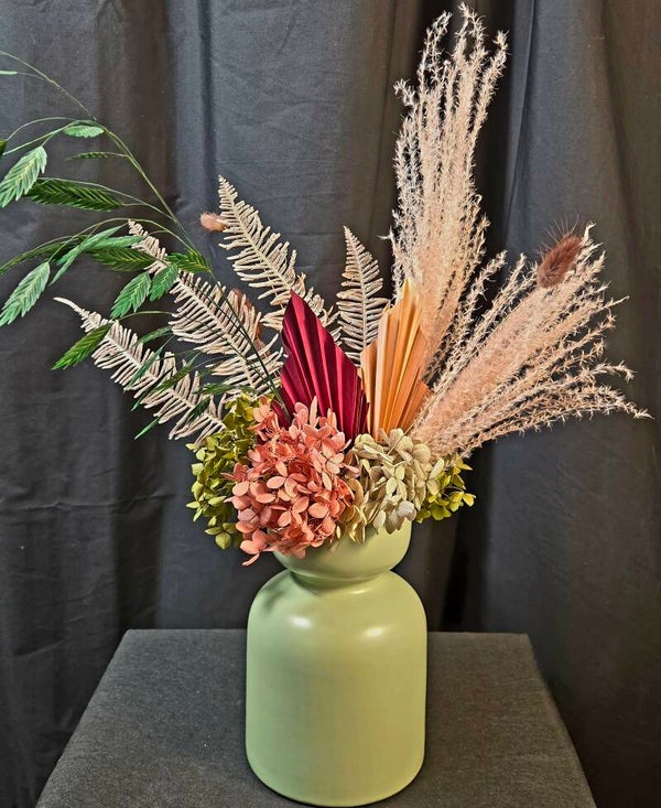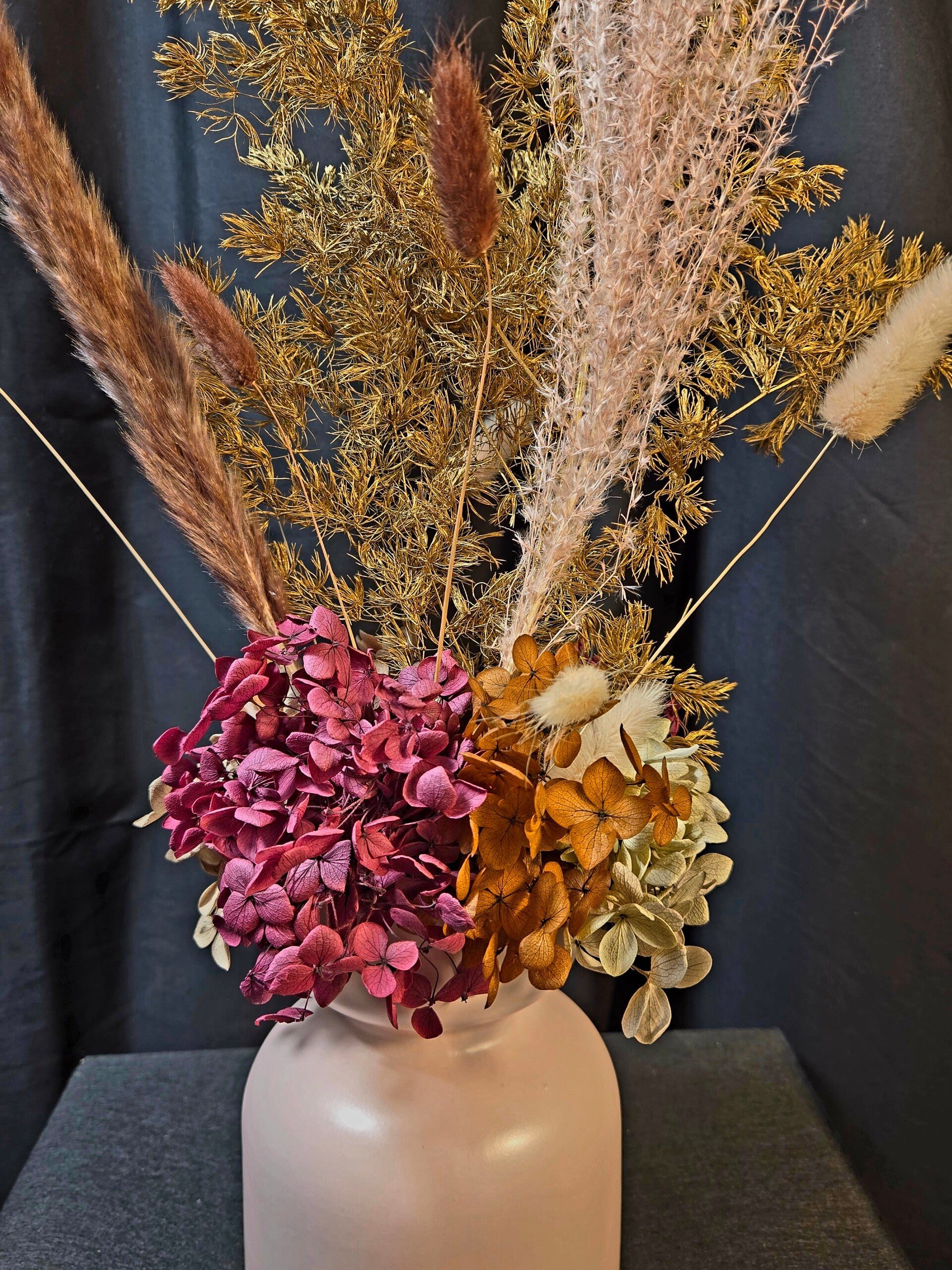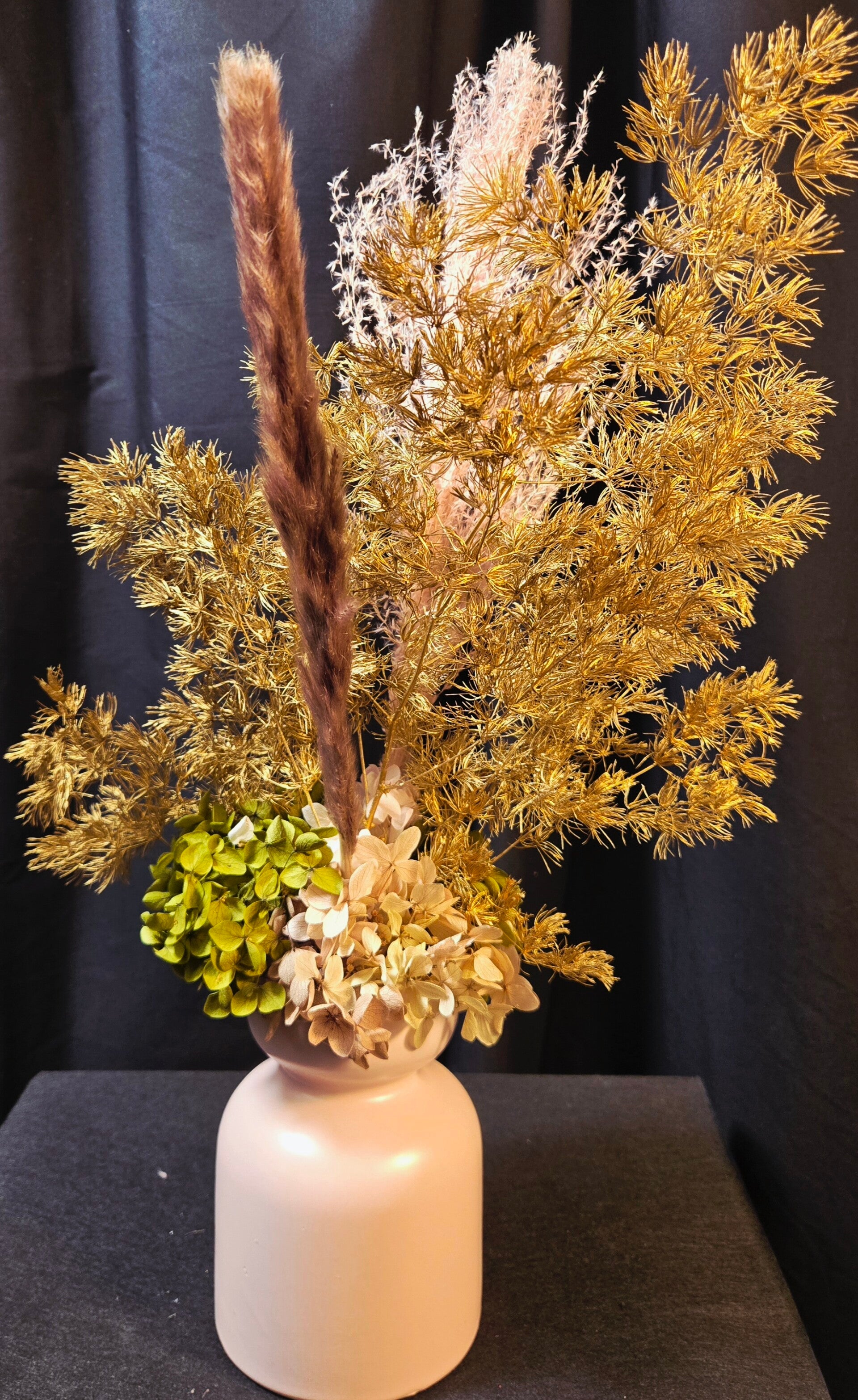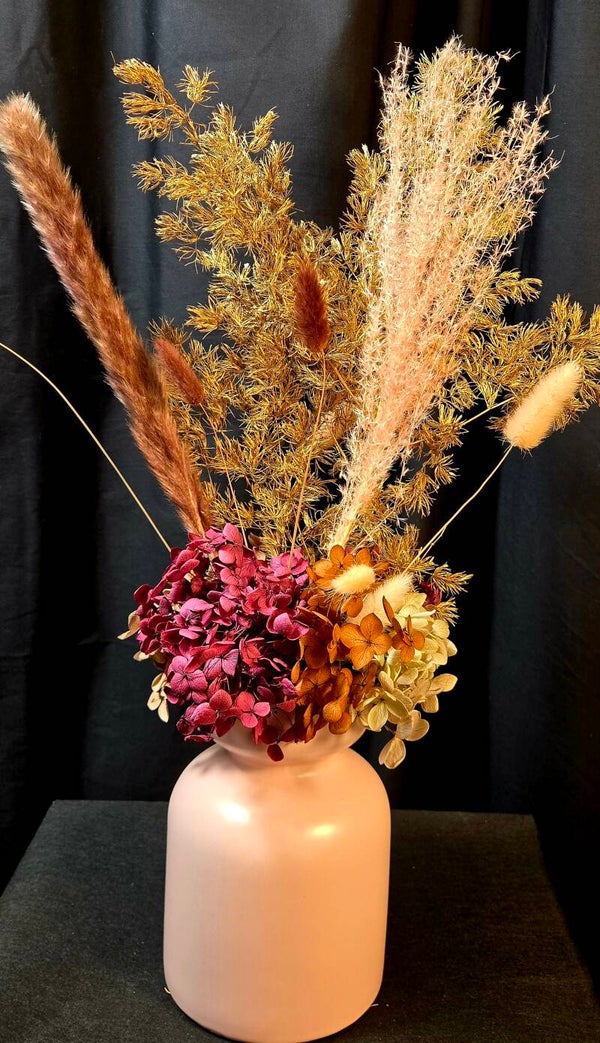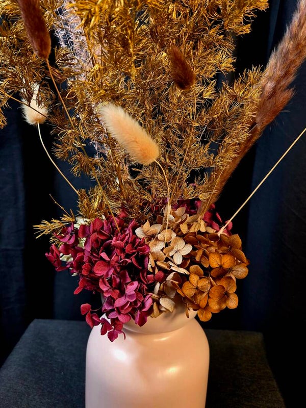 Rich, warm, and beautifully everlasting — this preserved arrangement is designed to make a sophisticated statement. Featuring real botanicals that have been professionally preserved, this piece showcases shimmering golden foliage, soft bunny tails, and layered hydrangea in deep blush and earthy caramel tones, all styled in a modern matte vase.