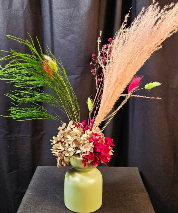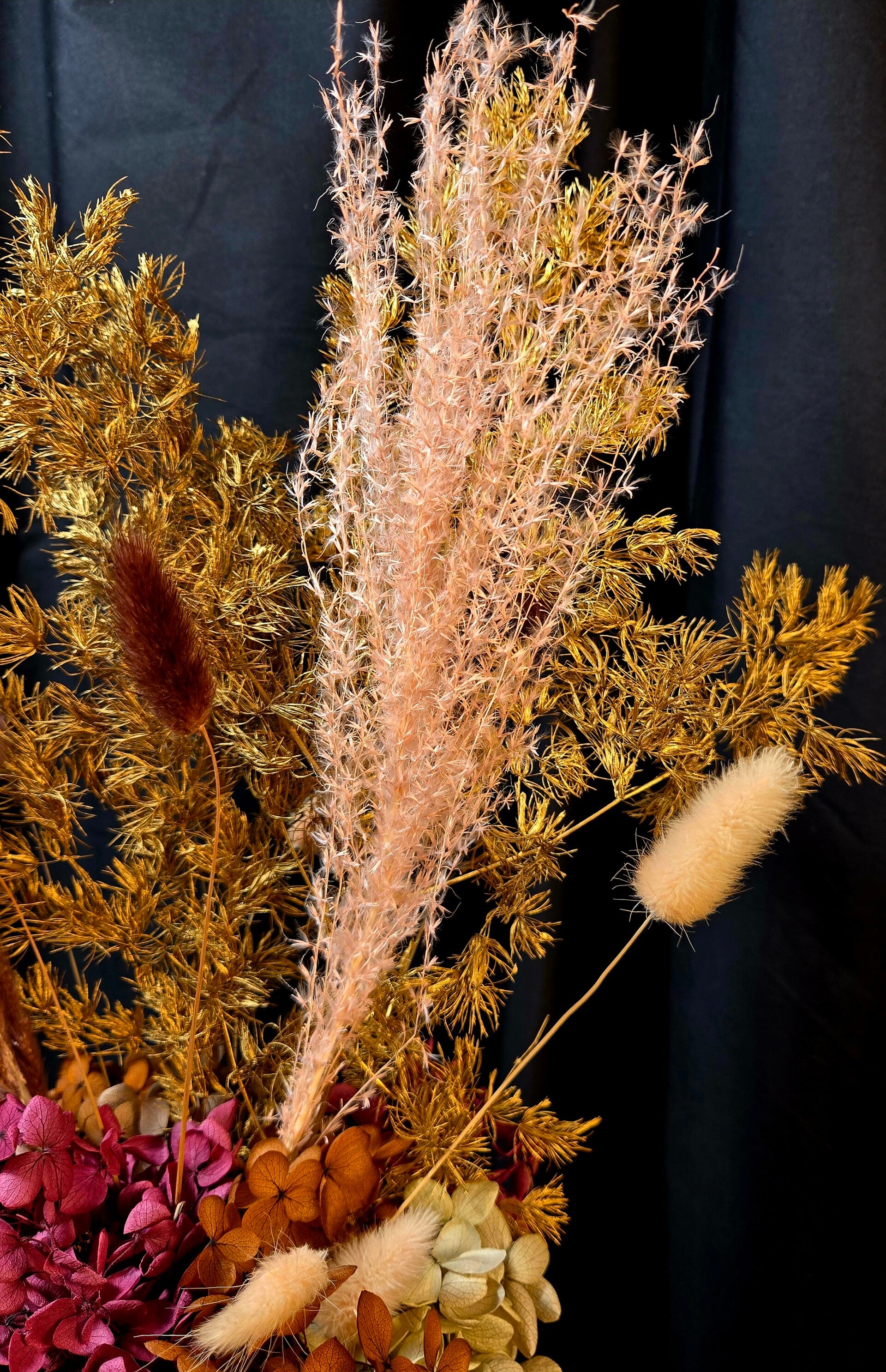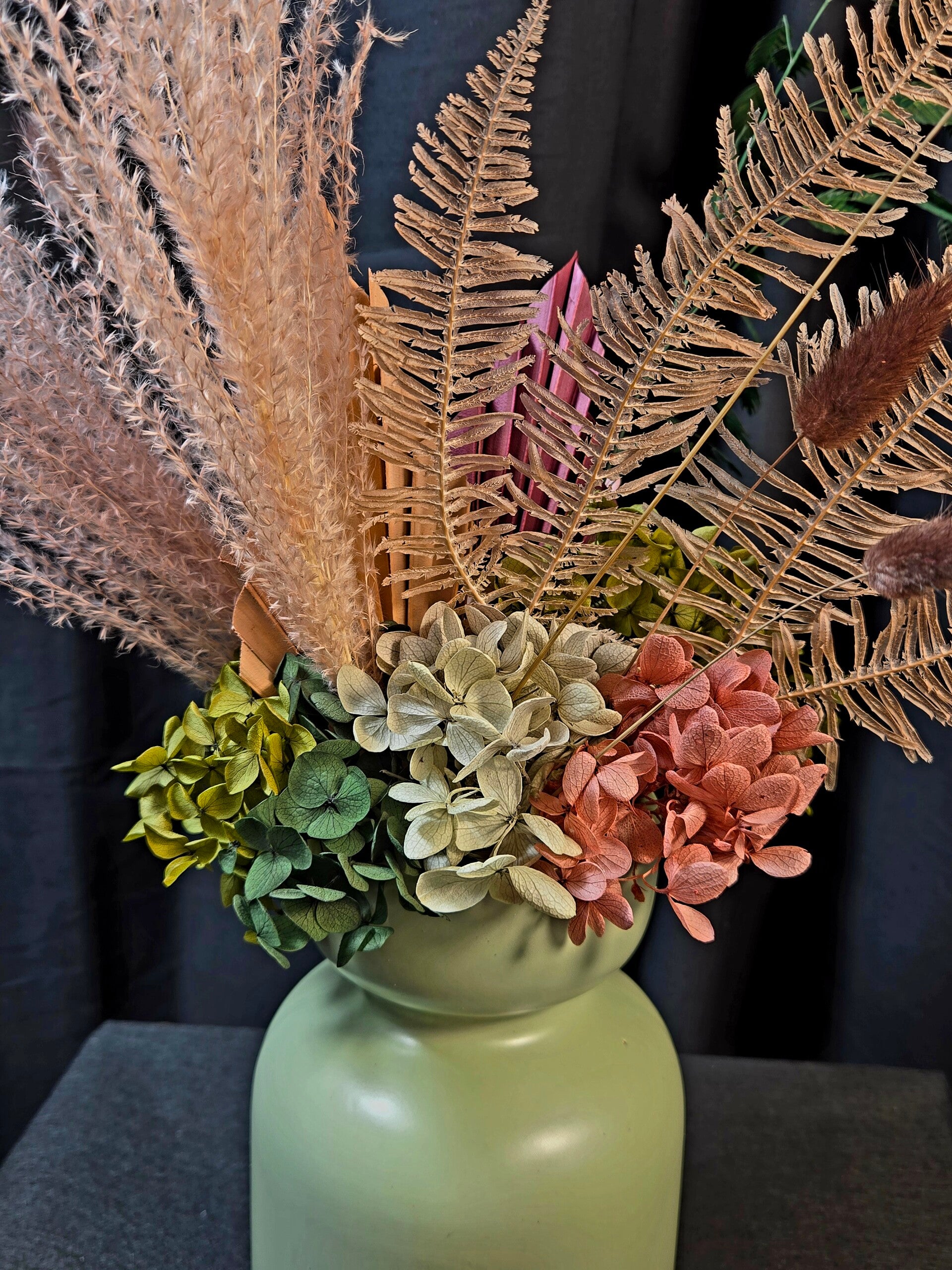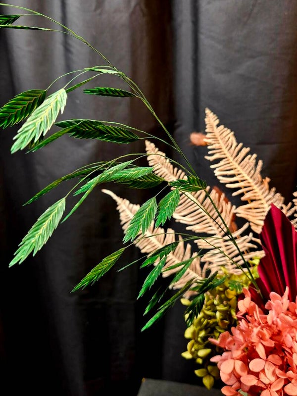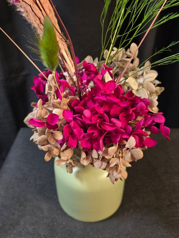 Rich, warm, and beautifully everlasting — this preserved arrangement is designed to make a sophisticated statement. Featuring real botanicals that have been professionally preserved, this piece showcases shimmering golden foliage, soft bunny tails, and layered hydrangea in deep blush and earthy caramel tones, all styled in a modern matte vase.