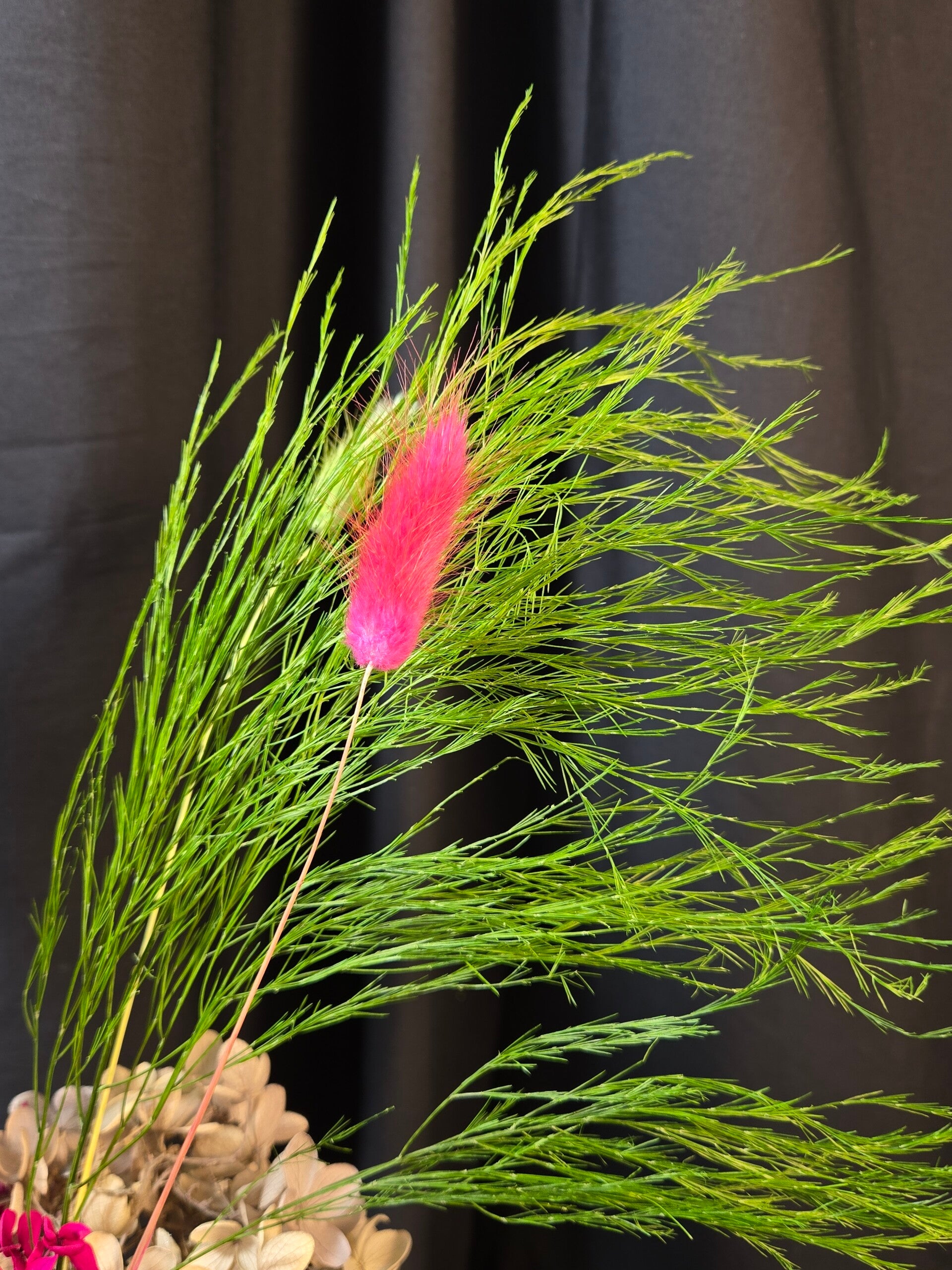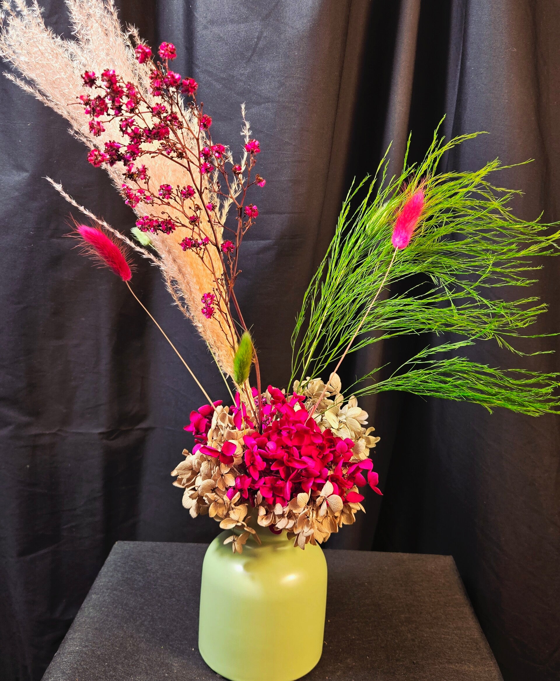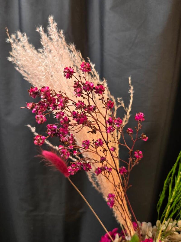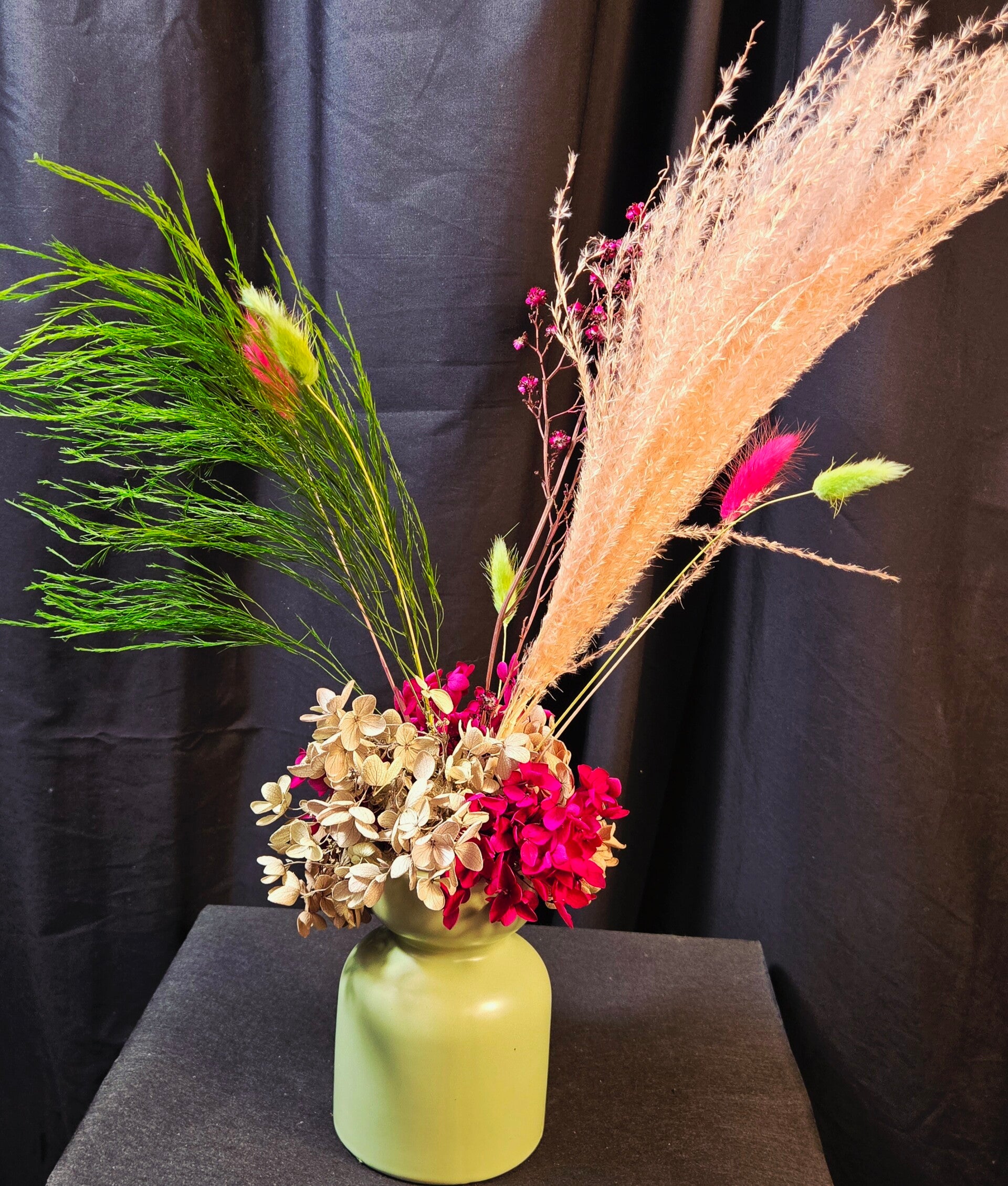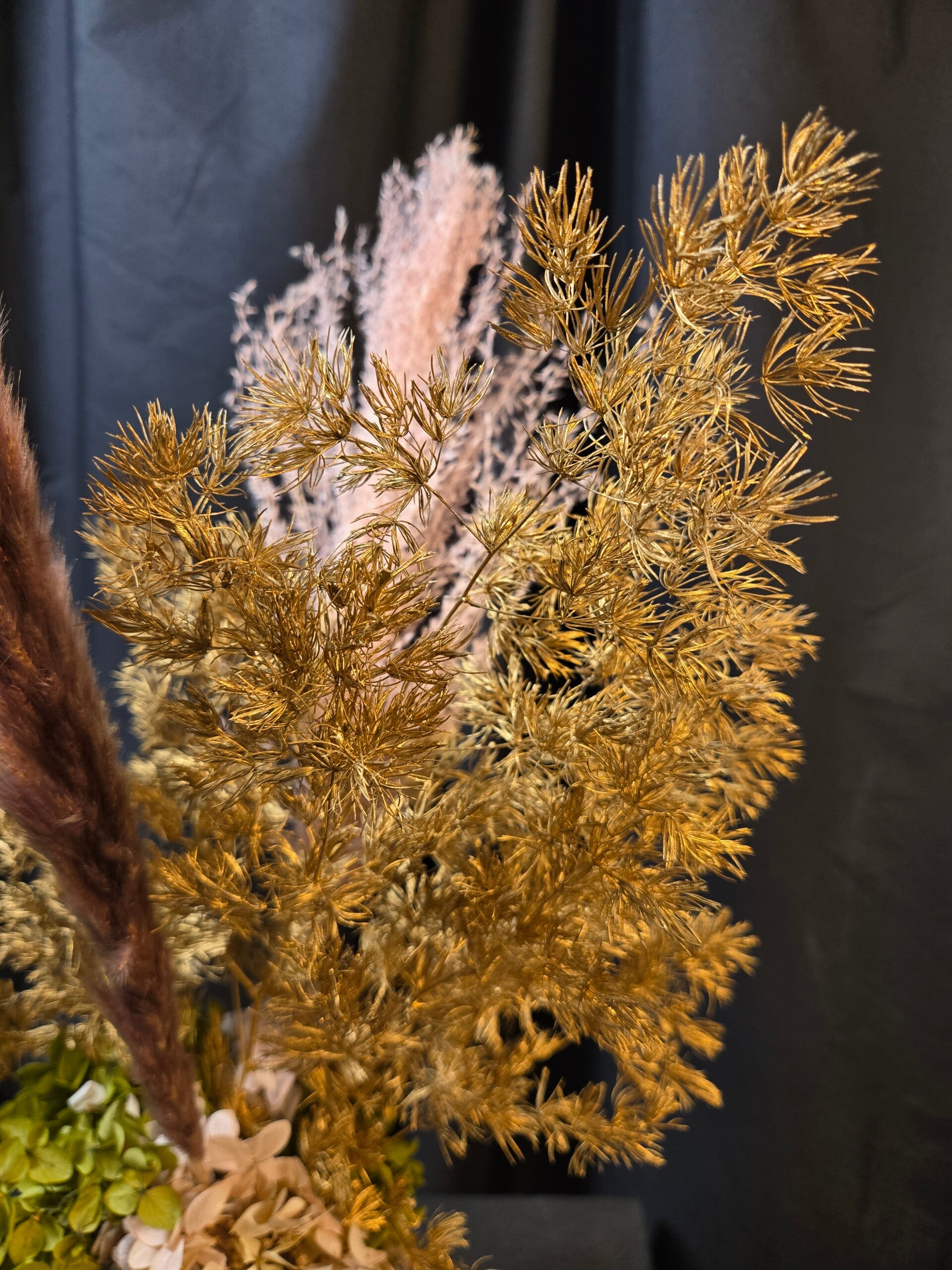Rich, warm, and beautifully everlasting — this preserved arrangement is designed to make a sophisticated statement. Featuring real botanicals that have been professionally preserved, this piece showcases shimmering golden foliage, soft bunny tails, and layered hydrangea in deep blush and earthy caramel tones, all styled in a modern matte vase.