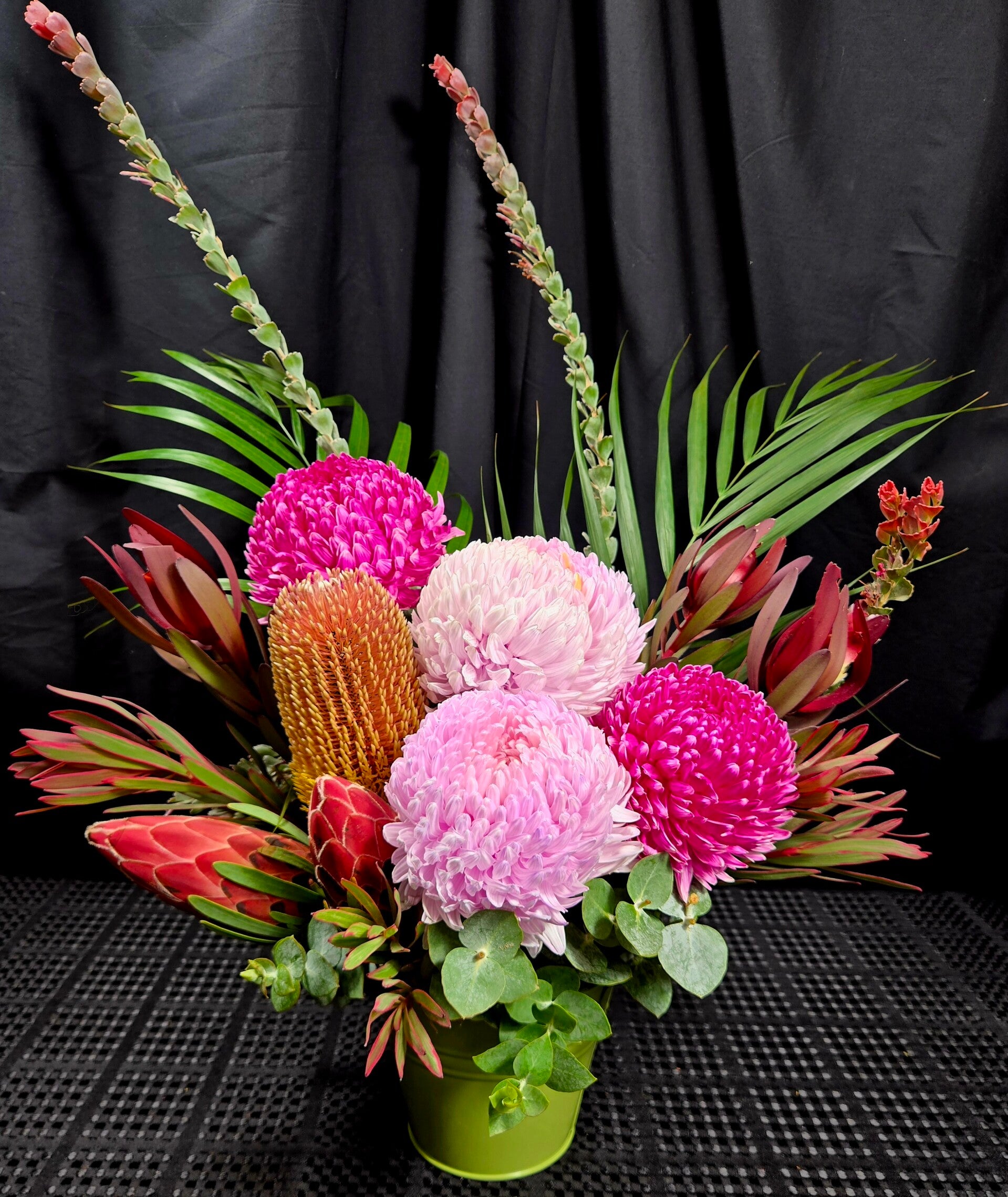Carefully arranged in a modern metal pot, the combination of soft pink tones and rich native elements creates a stunning balance between delicate blooms and the wild beauty of Australian botanicals.