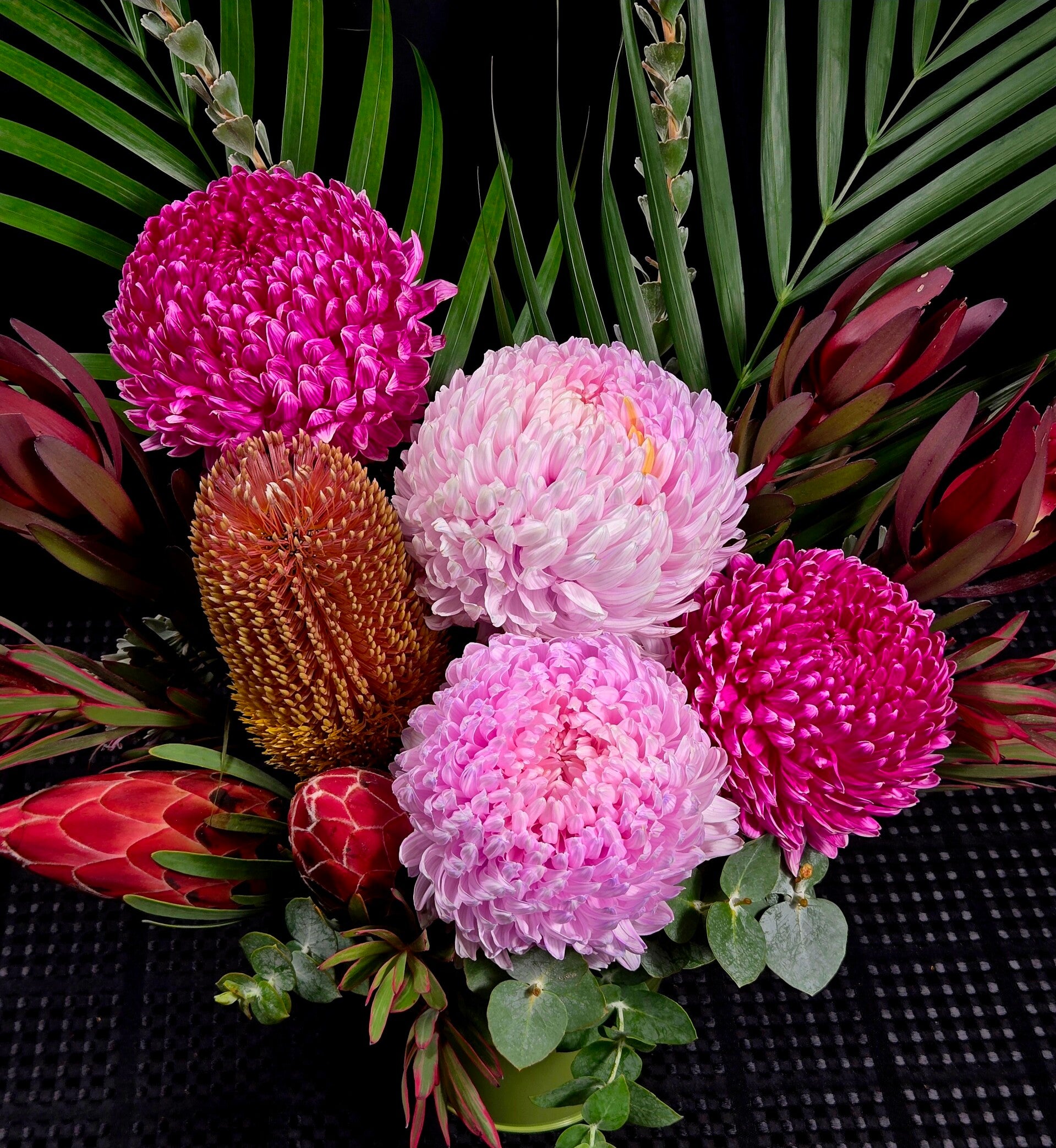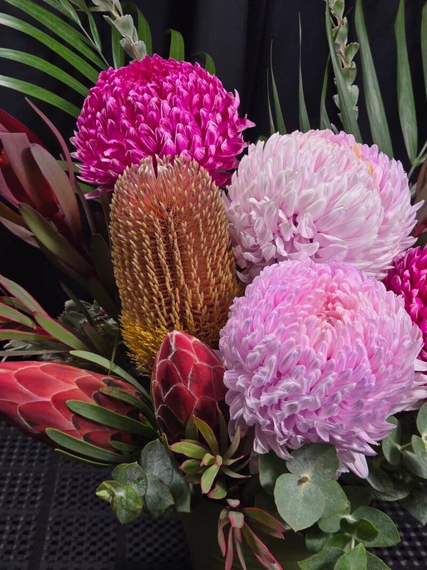 Bright, bold and bursting with Australian charm, Wild Pink Wonder is a vibrant arrangement that celebrates the beauty of native flowers with a playful splash of colour. Featuring lush pink disbud chrysanthemums paired with striking banksias and sculptural native foliage, this design is full of texture, movement and personality.