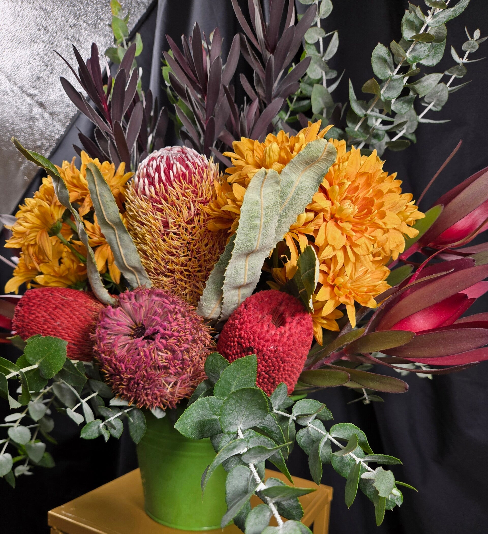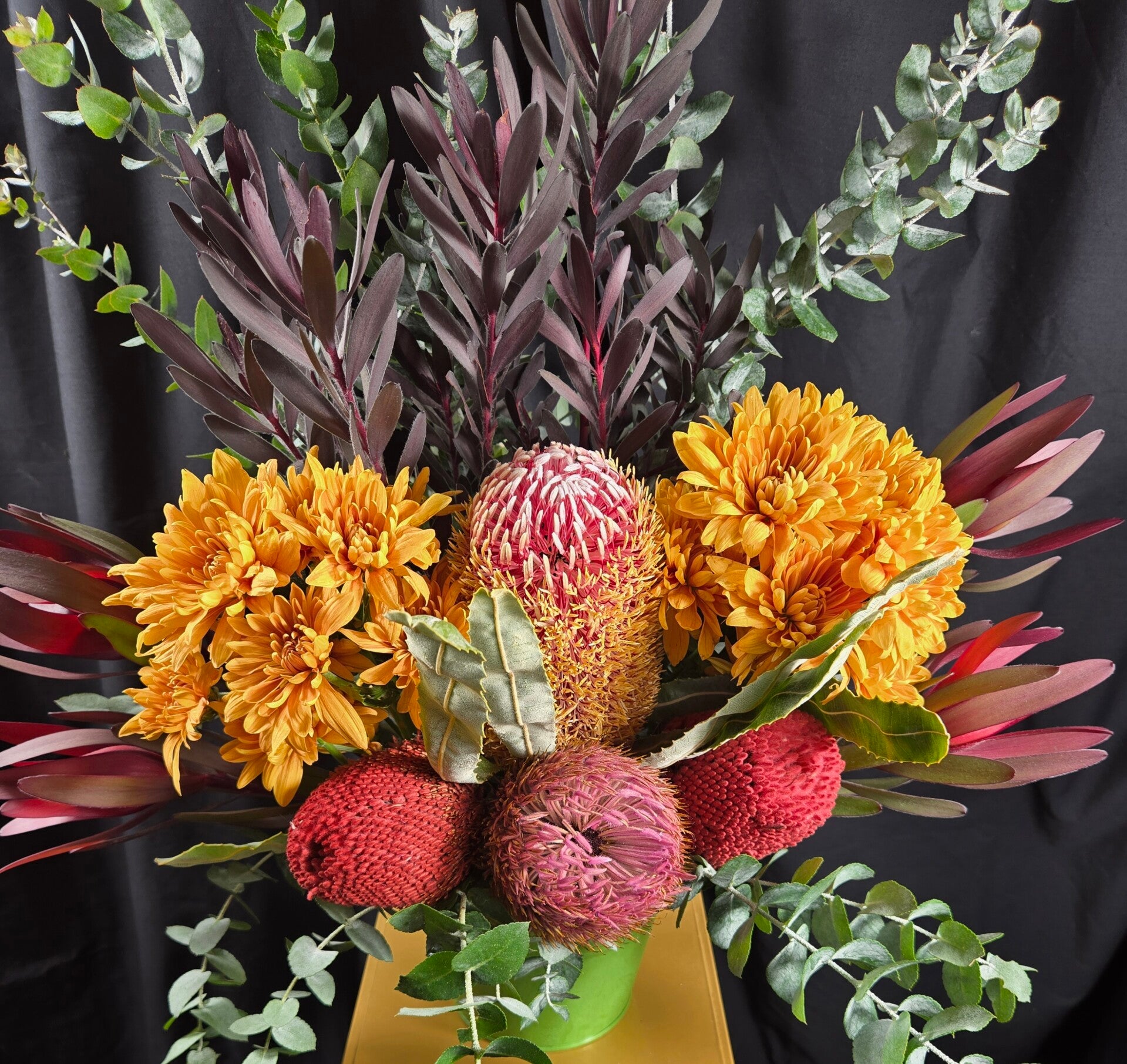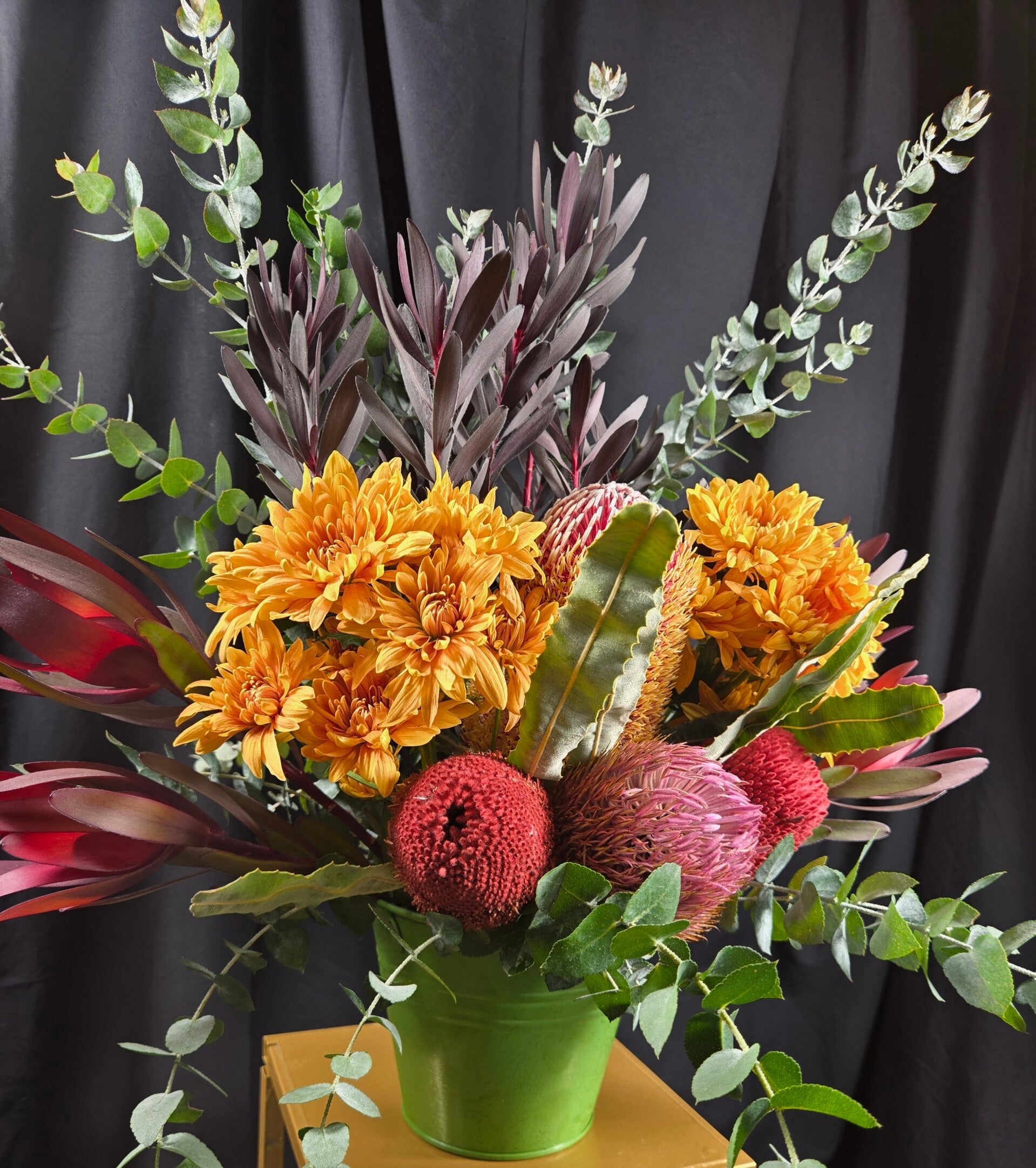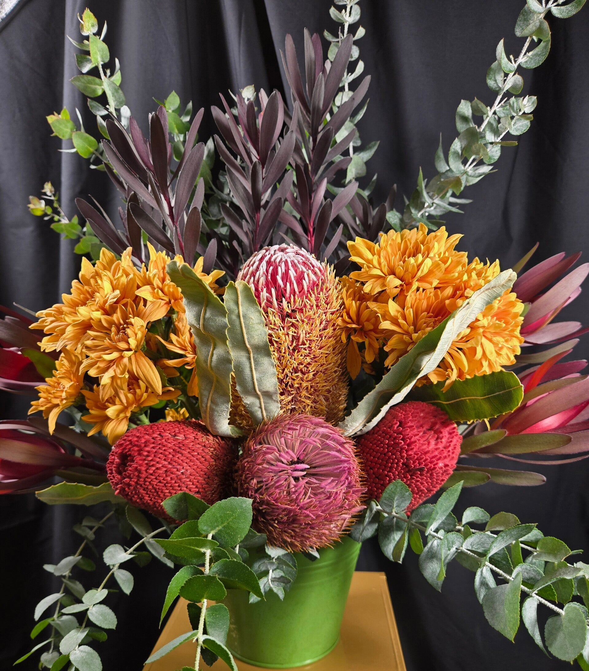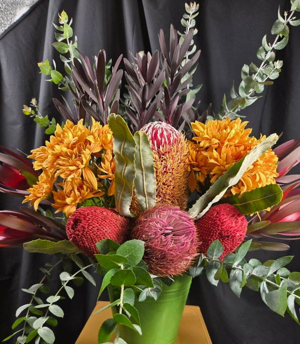 Bushland Beauty is a striking native arrangement designed to make a statement. Featuring a spectacular mix of colourful banksias, Leucadendrons and soft chrysanthemums and lush eucalyptus foliage, this arrangement celebrates the wild beauty of Australian native