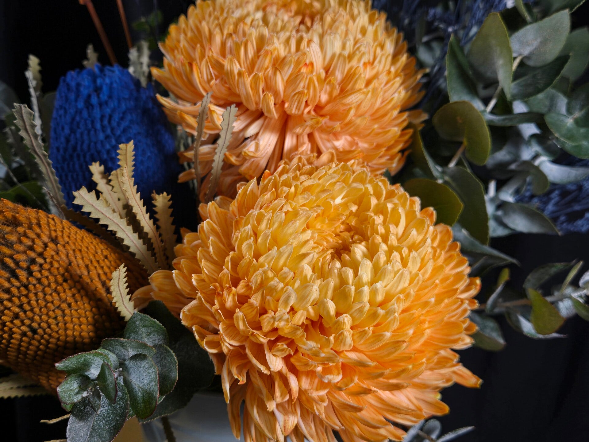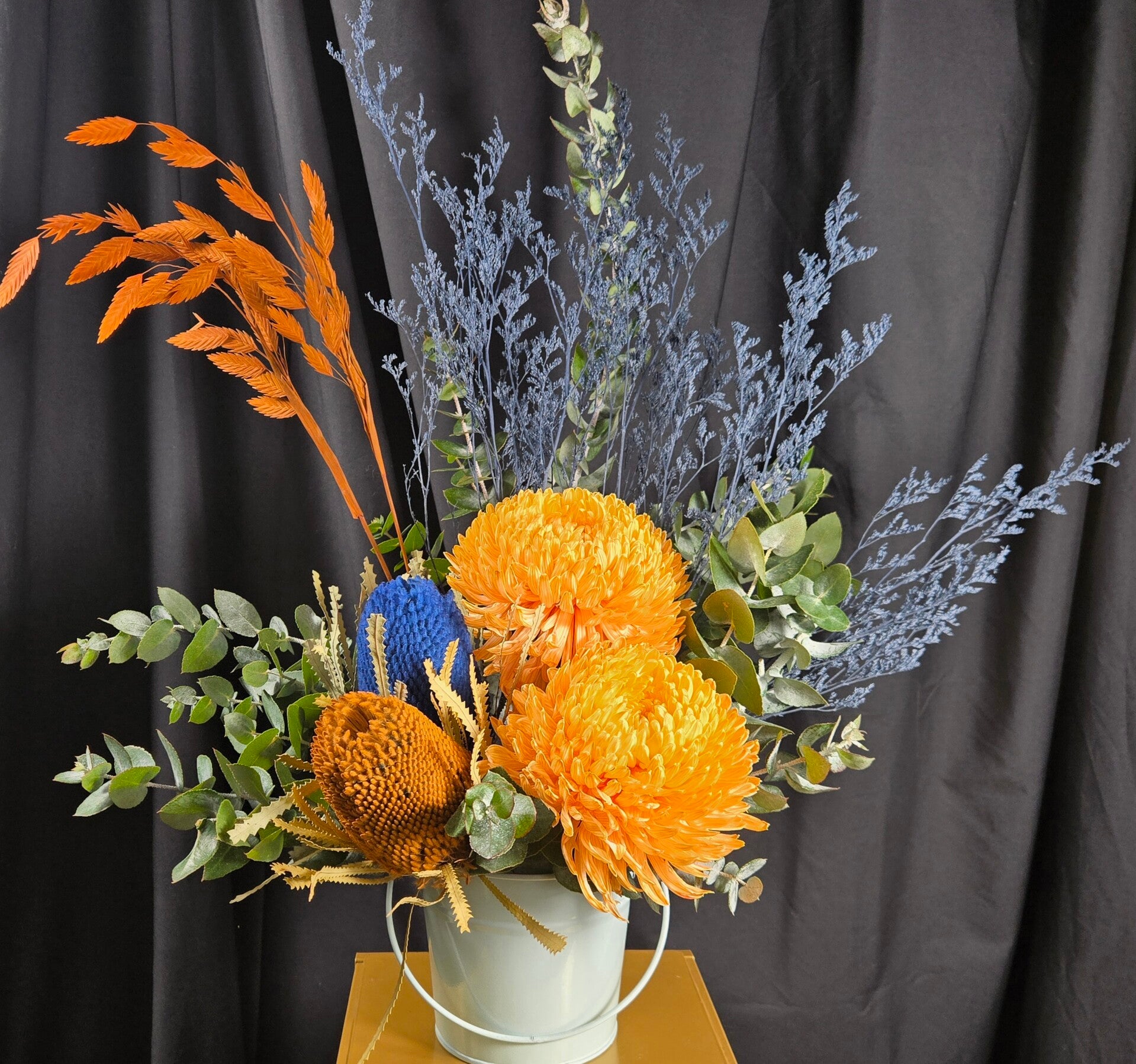 This striking design features glowing orange disbud chrysanthemums, textured banksia, and a dramatic dyed blue banksia focal bloom, beautifully balanced with natural eucalyptus foliage and airy preserved accents. Arranged in a stylish keepsake metal pot, this piece combines rich texture, sculptural form, and vivid colour to create a statement arrangement that feels both contemporary and uniquely Australian.
