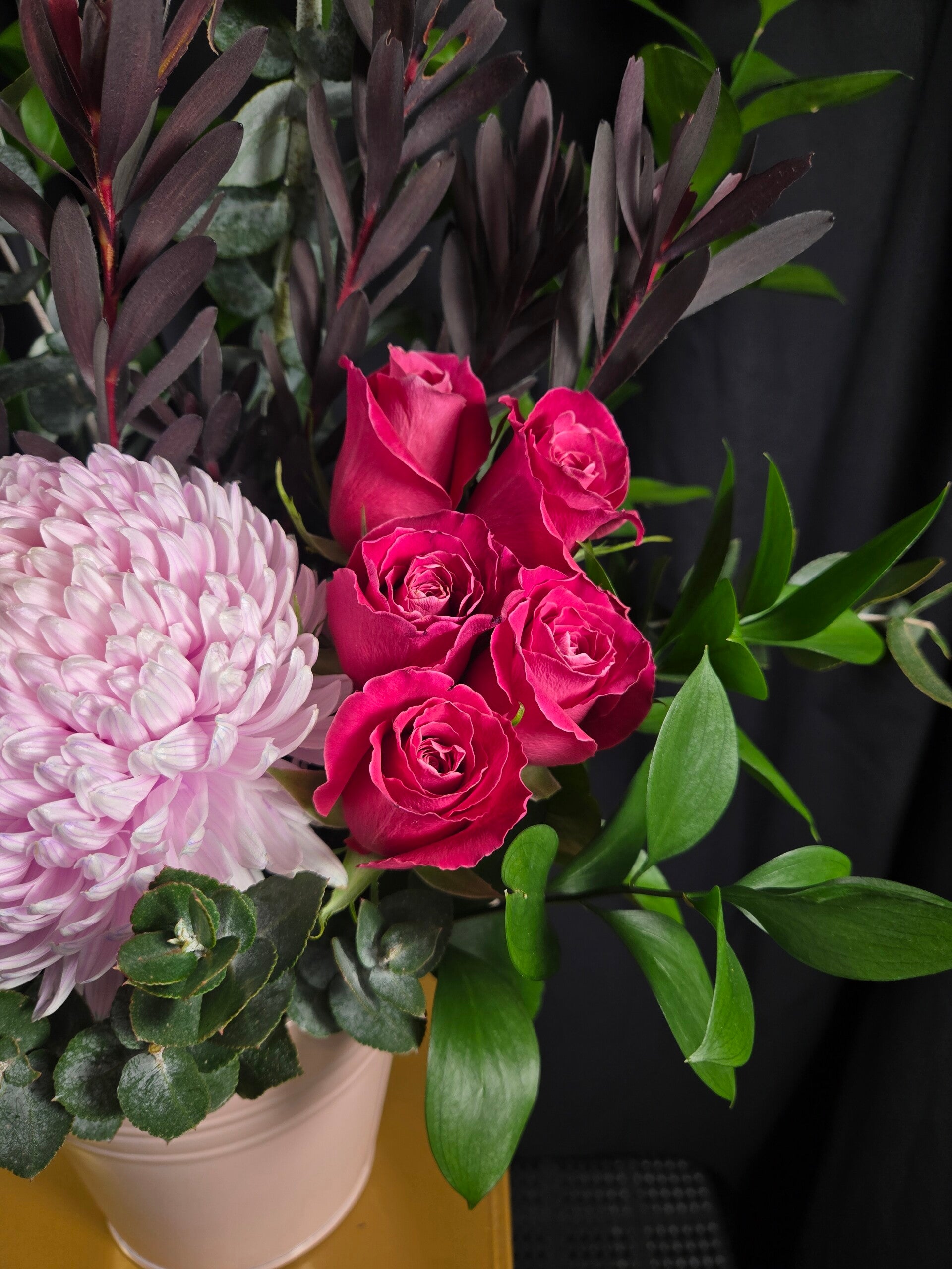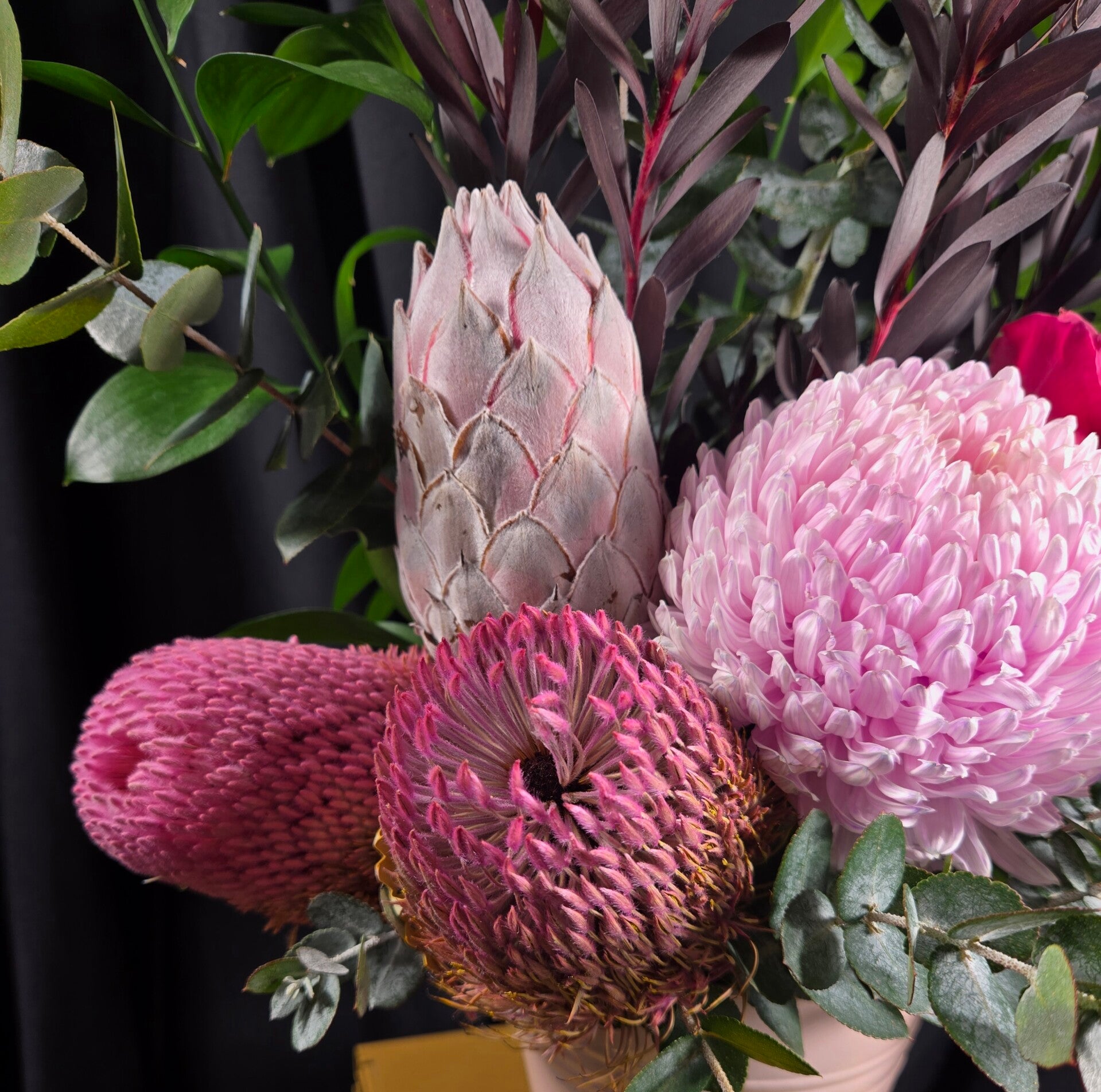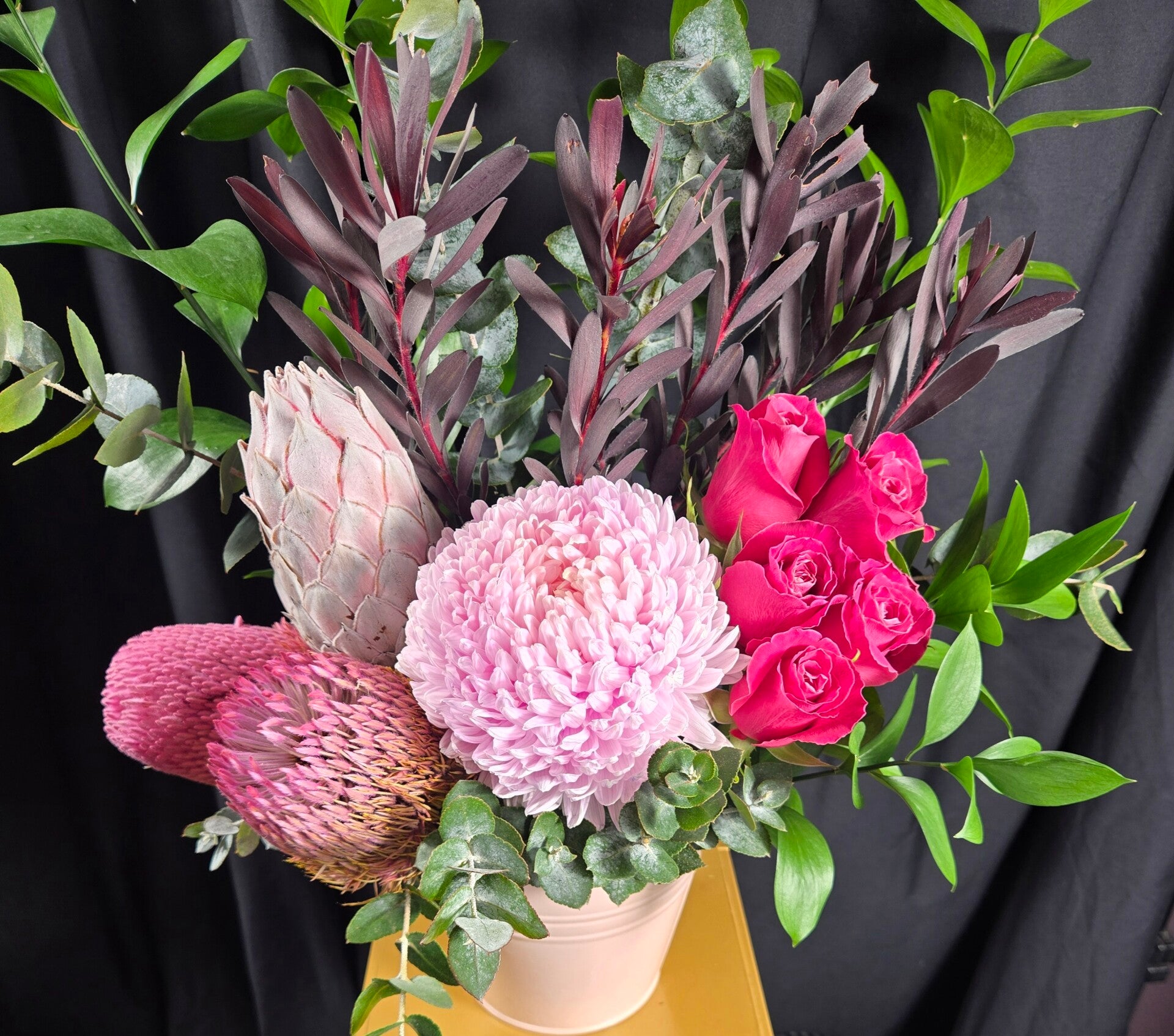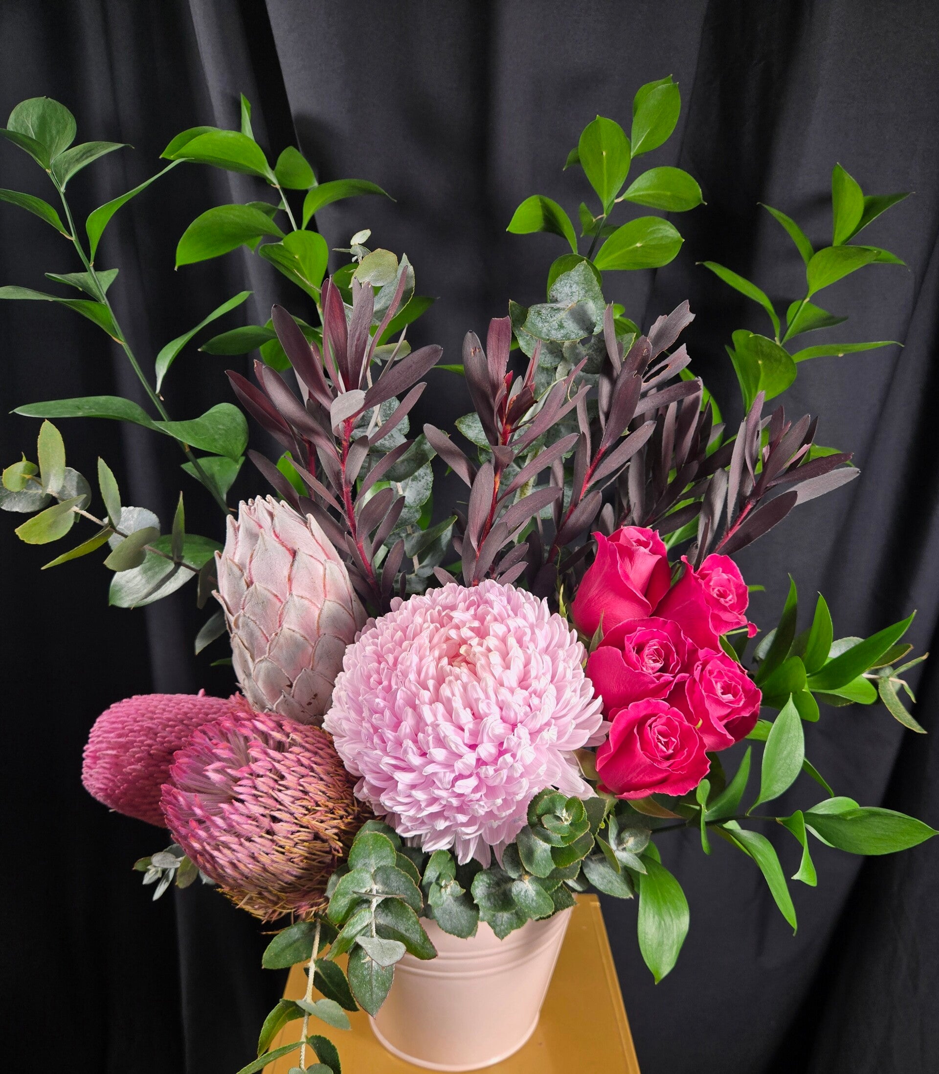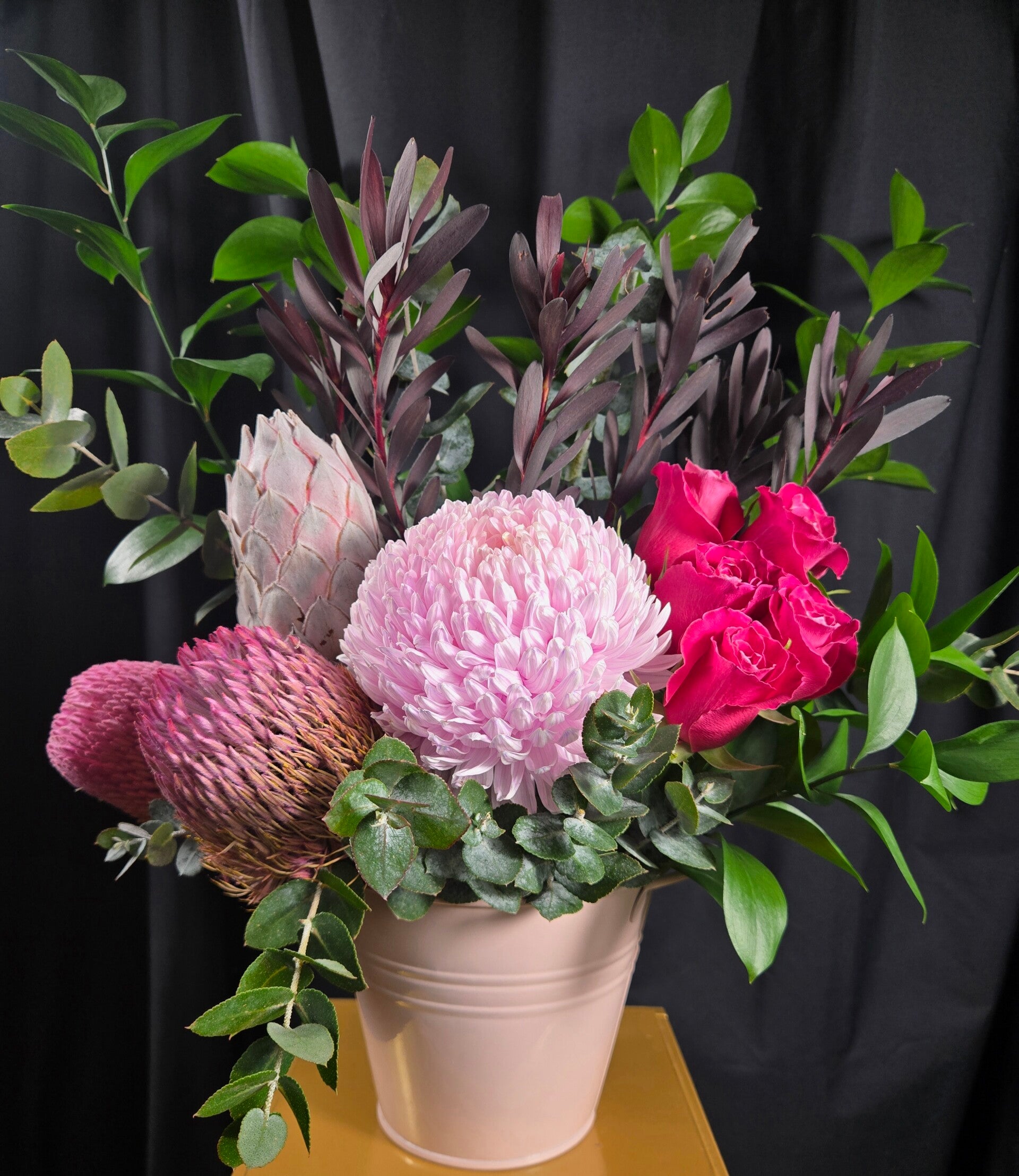 This eye-catching design features a gorgeous blush pink disbud chrysanthemum, vibrant cerise roses, and sculptural banksia and protea, nestled among lush seasonal foliage and rich native textures. Arranged in a stylish keepsake metal pot, it creates a striking mix of softness and wild beauty that makes a perfect gift for almost any occasion.