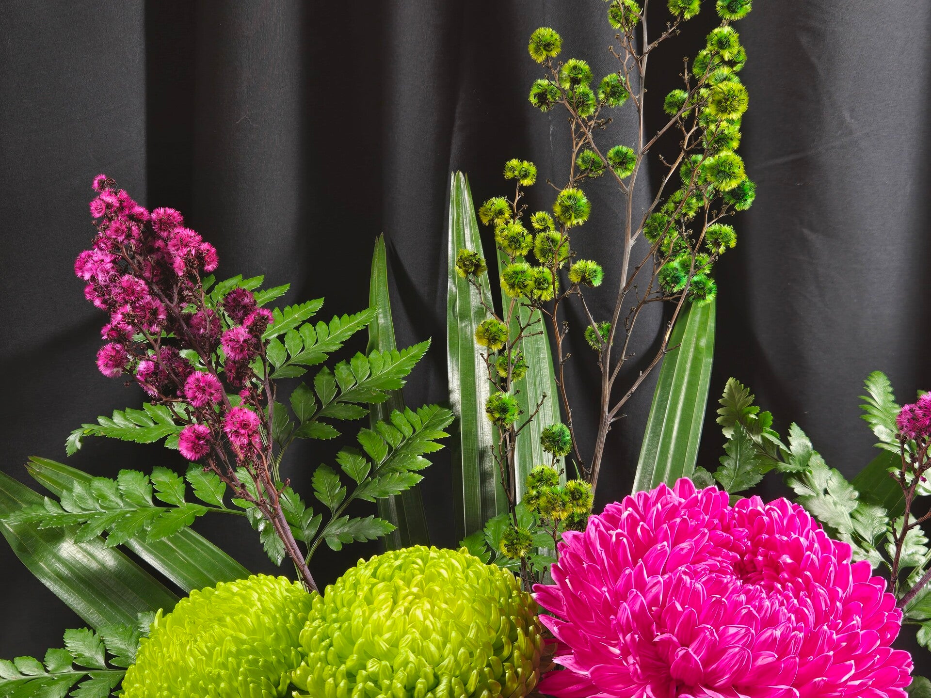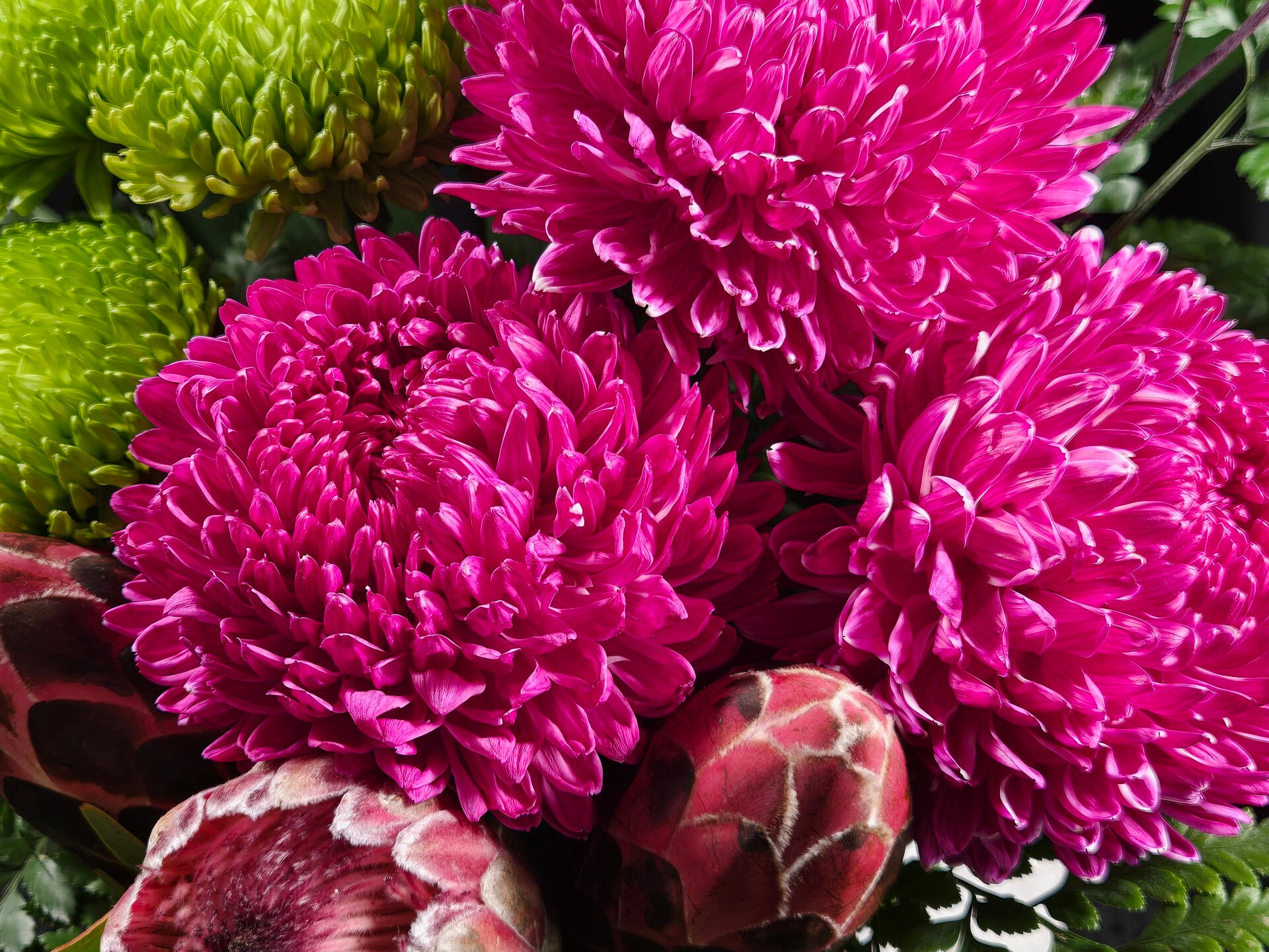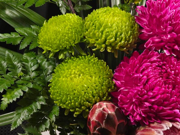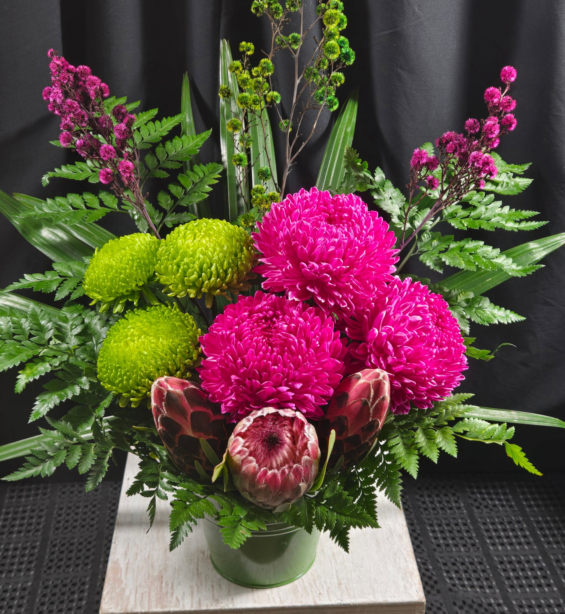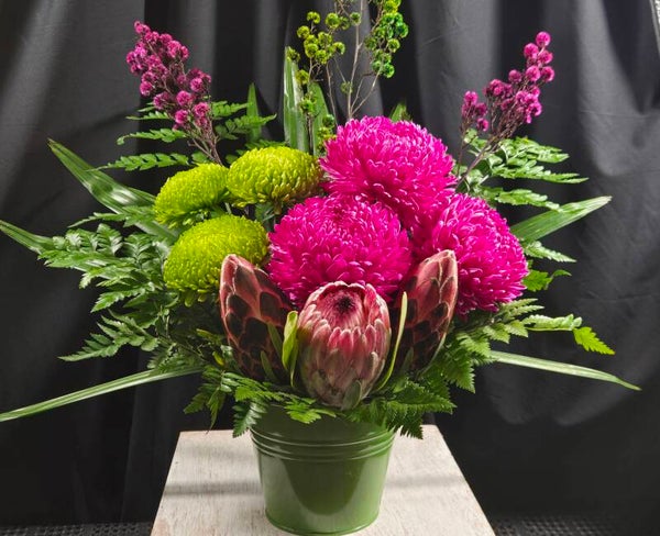 Bold, bright and bursting with personality, Wild Pop Darling is a statement arrangement designed to turn heads and lift moods instantly. Featuring striking hot pink disbuds, vibrant green chrysanthemums, and a stunning native protea as the focal point, this arrangement perfectly blends playful colour with natural texture.