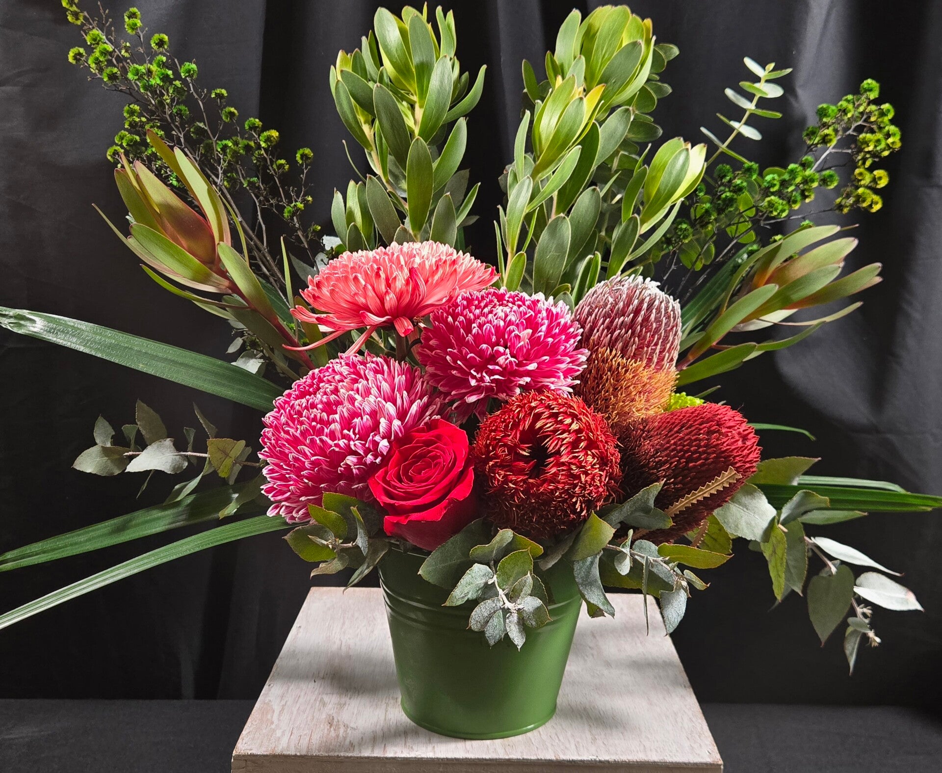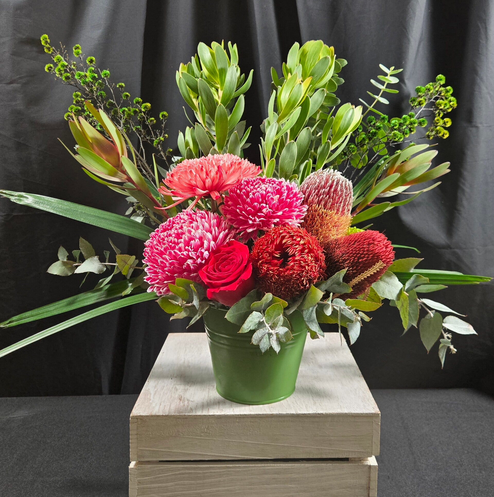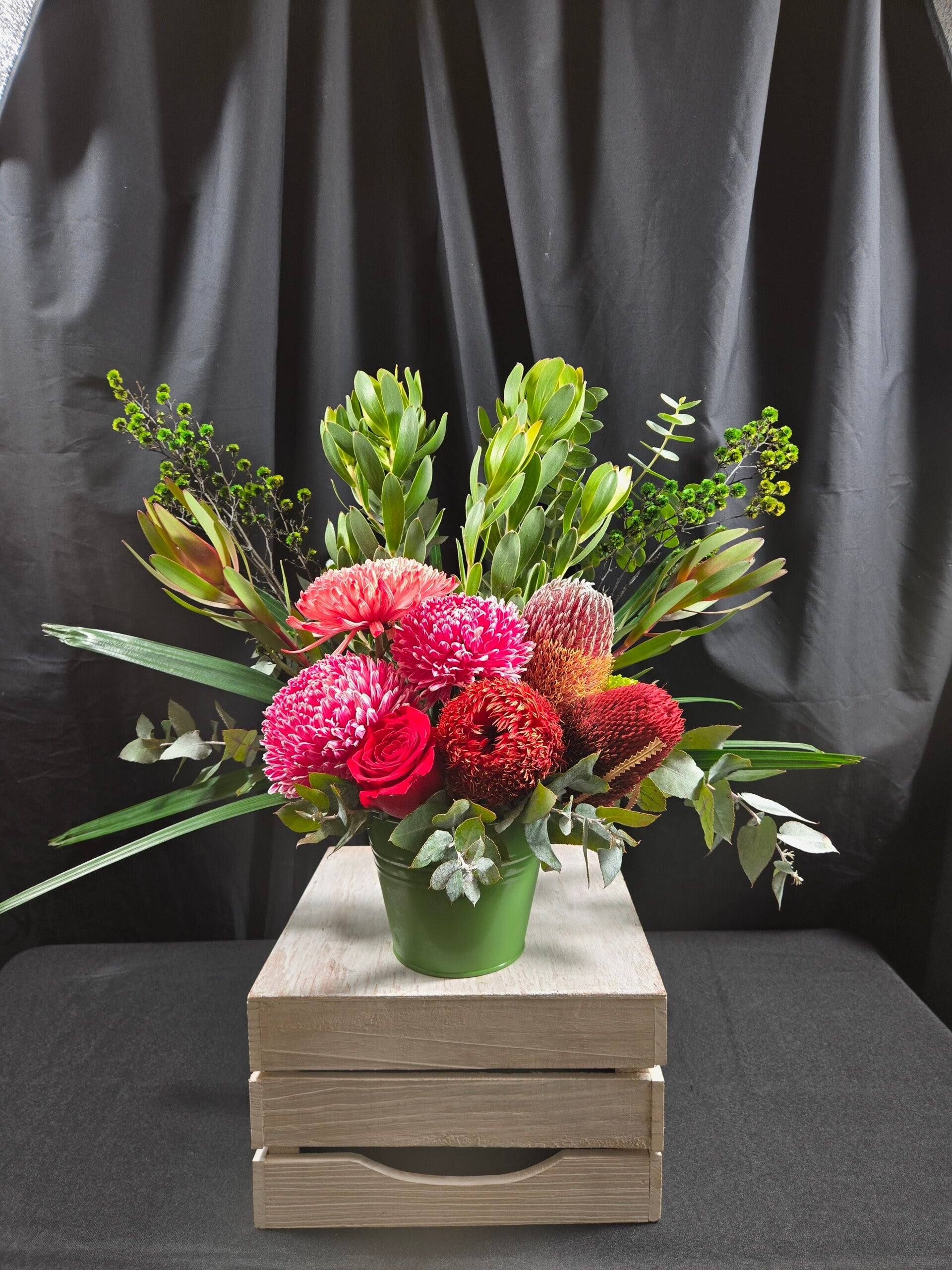 Layered with depth, colour and natural movement, it captures the beauty of Australian natives while softening the look with elegant, garden-style blooms. The mix of textures—from spiky banksias to velvety petals—creates a visually stunning piece that feels full, fresh, and effortlessly styled.