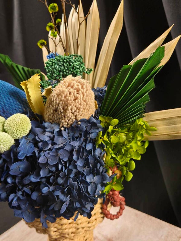 Featuring sculptural banksias, velvety preserved hydrangea in deep navy, and layered accents of rich, verdant greens, this arrangement balances moody depth with fresh, natural vibrancy. Framed with structured dried foliage and presented in a woven vessel, it offers a sophisticated fusion of raw Australiana and contemporary elegance.