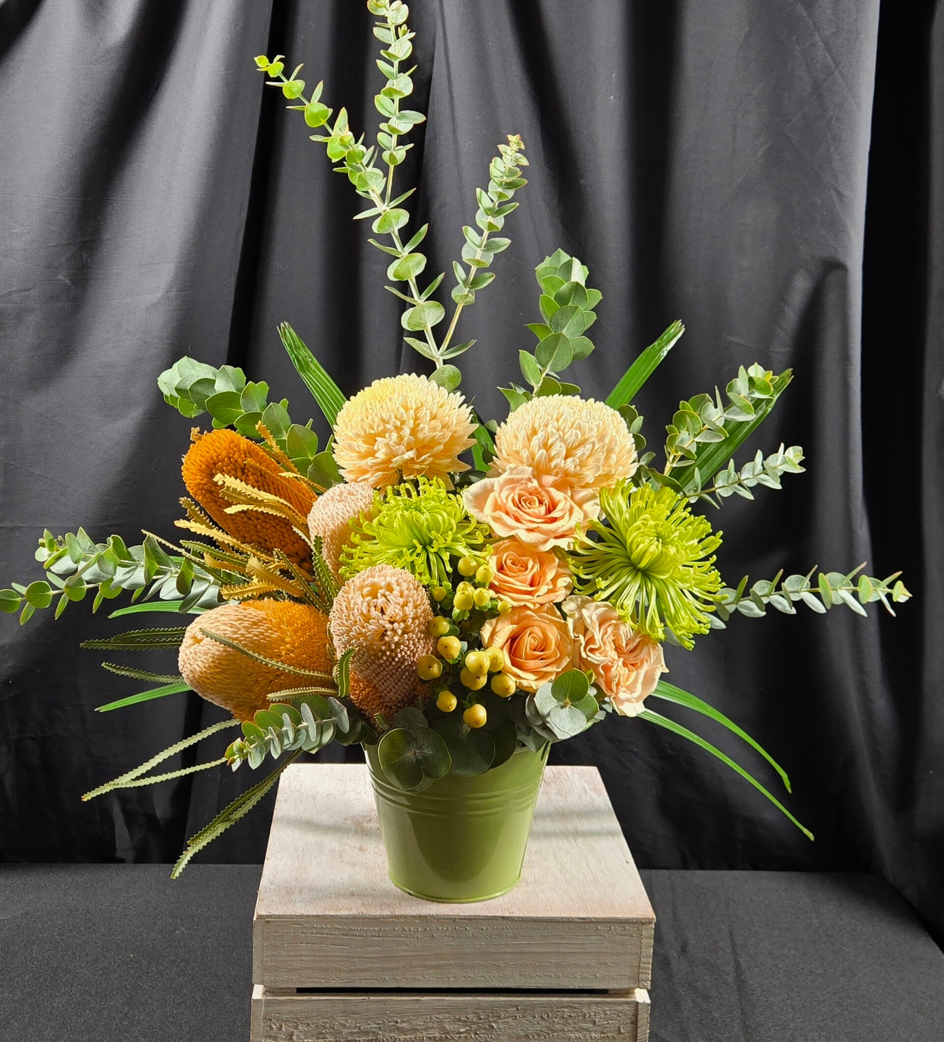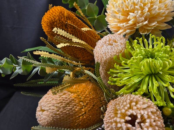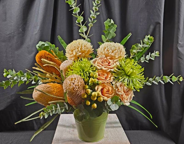 Turn up the temperature with Golden Heart — a bold, flirtatious arrangement where native textures meet soft, seductive blooms. Rich caramel-toned banksias and sculptural natives bring depth and attitude, while lush peach roses and vibrant lime chrysanthemums soften the look with a fresh, irresistible glow. Finished with eucalyptus and layered greenery, this piece is all about contrast, confidence, and effortless style.