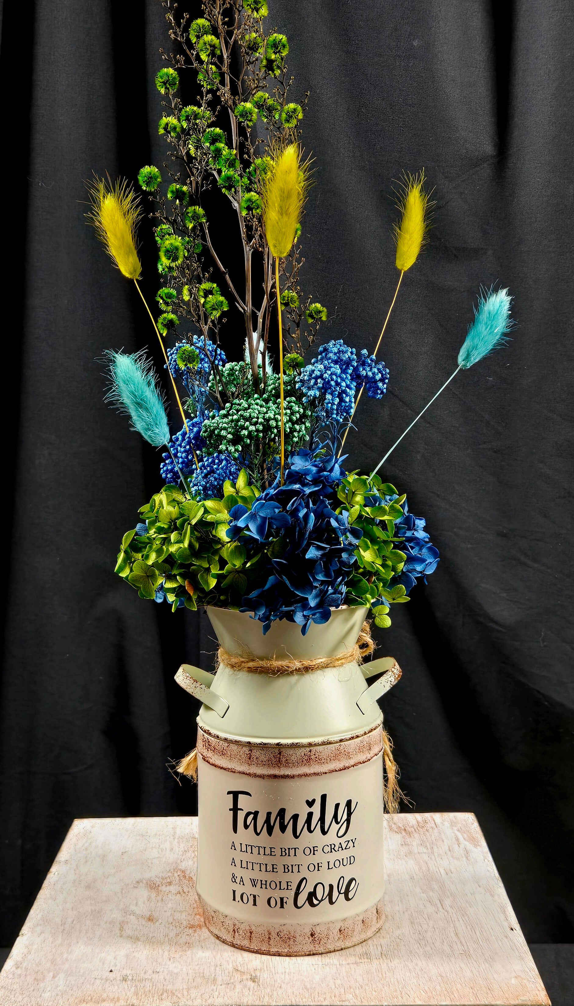 Fresh, vibrant, and full of life, this arrangement captures the essence of nature with a modern twist. Featuring striking blues, fresh greens, and pops of golden yellow, it combines preserved hydrangea, textured foliage, and playful dried elements for a truly eye-catching display.