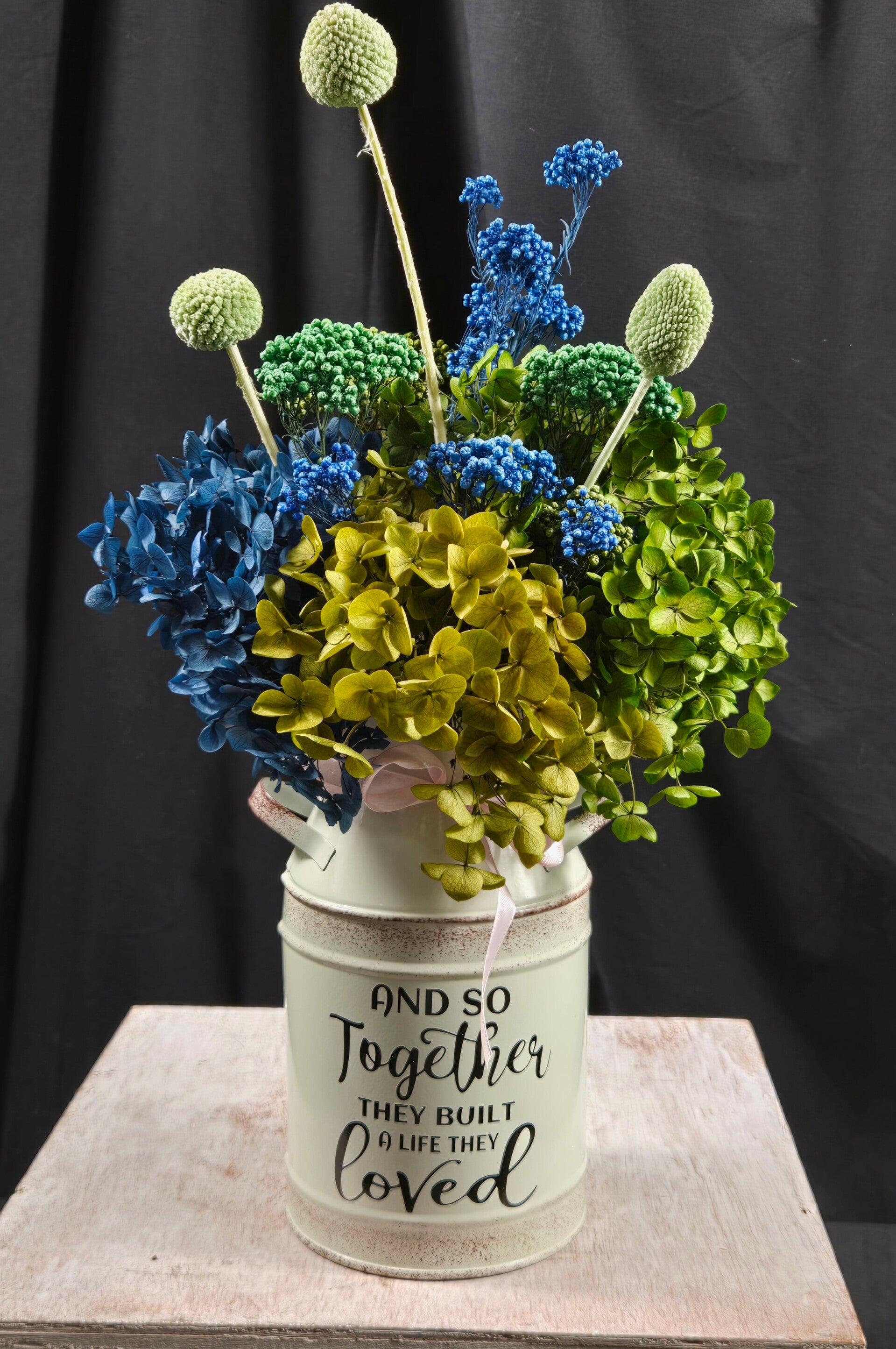 A striking blend of rich blues, fresh greens, and soft botanical textures, this preserved arrangement is designed to make a lasting impression. Featuring lush preserved hydrangea, sculptural billy buttons, and layered dried elements, it brings a modern, nature-inspired feel into any space.